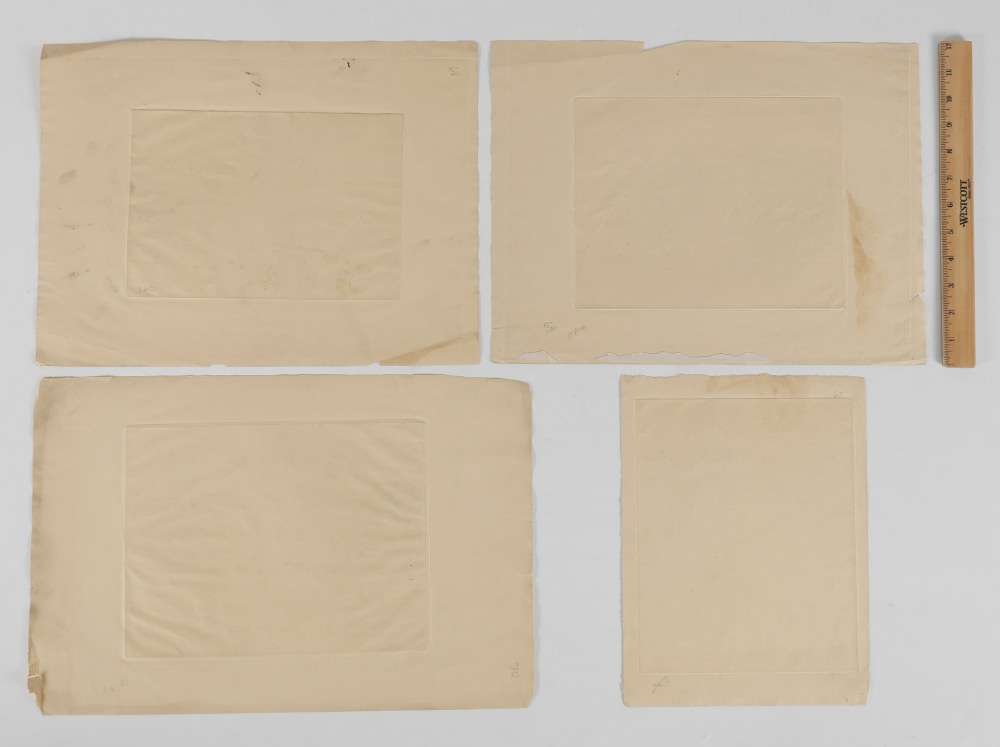 CONDITION: Scattered smudges, lower left corner folded over, minor handling creases; 2) Several visible creases, some scattered minor handling creases, minor toning in the image, several tears in the margins and pinholes in all 4 corners; 3) Visible toning and discoloration, several creases in the corners, minor paper loss in the margins; 4) Several tears in the margins, corners are tattered or rounded, several handling creases, sold as is.