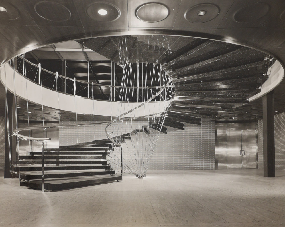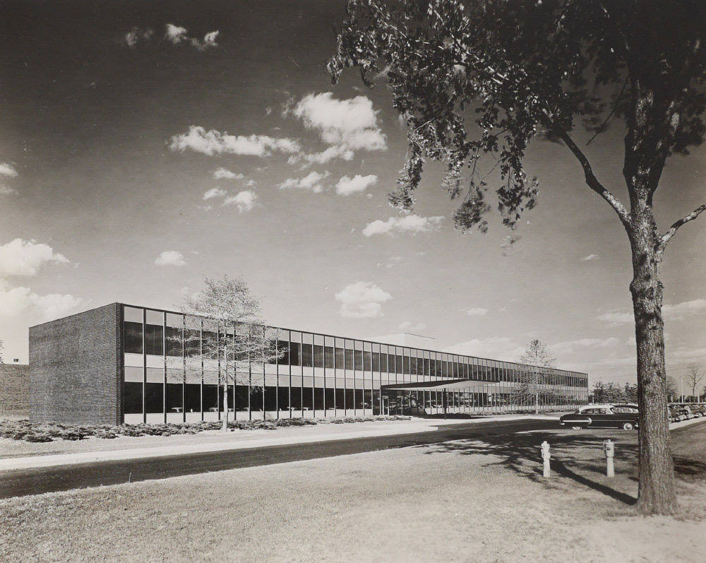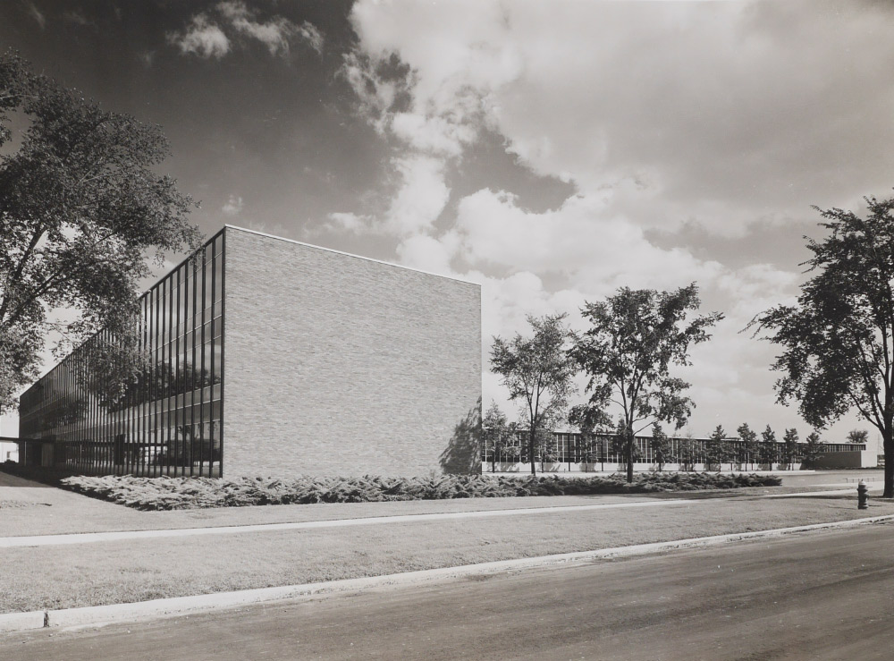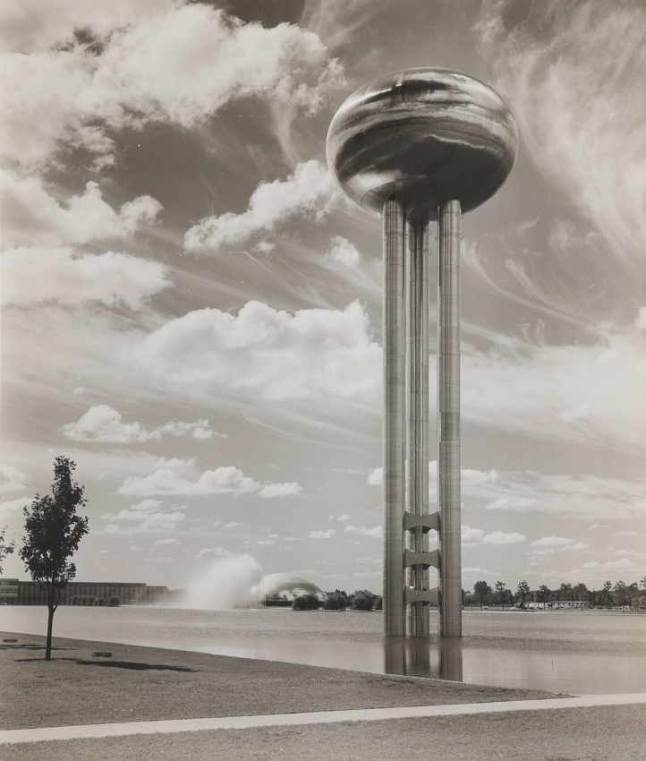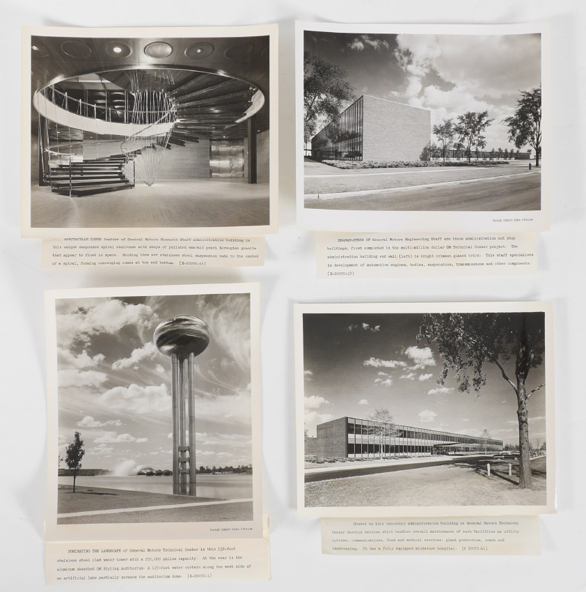 STOLLER, Ezra, (American, 1915-2004): 4 Black and White photographs of General Motors building scenes to include, 1) Modern Lobby, 2) 2 photos of GM Technical Center, 4) GM Water Tower; all approximately 8'' x 10'', marked in the margin, ''please credit Ezra Stoller, unframed.