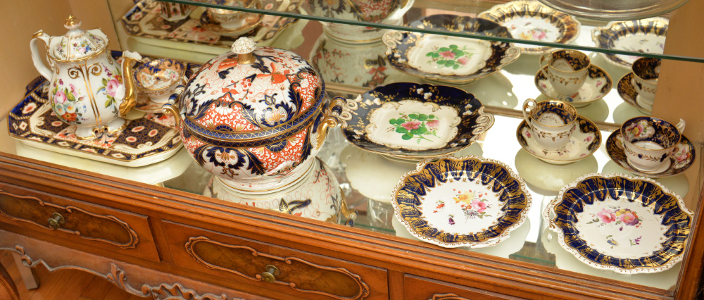 COLLECTION OF ENGLISH IMARI STYLE PORCELAIN: An assembled collection of 10 pieces total, 9 in the Imari style to include teacups and saucers, tureen, tray, vase and footed trays. All unsigned with the exception of a small Royal Crown Derby vase. Tureen measures 9 1/2'' x 12''. Sold with a floral and gilt teapot.