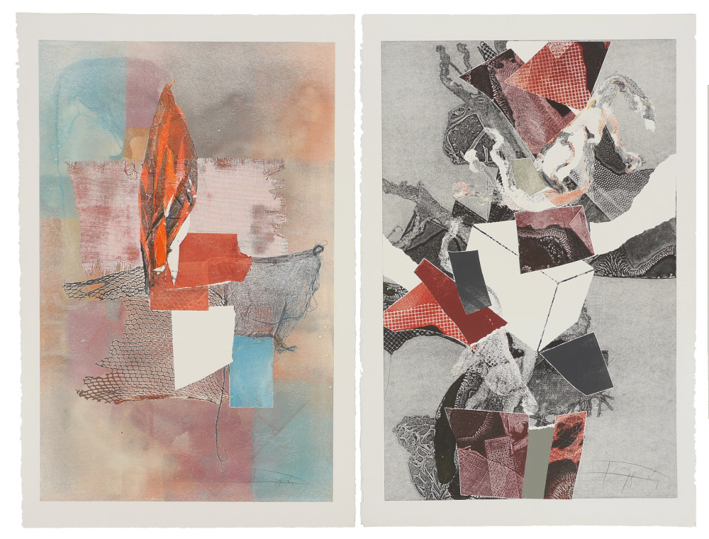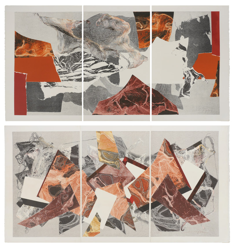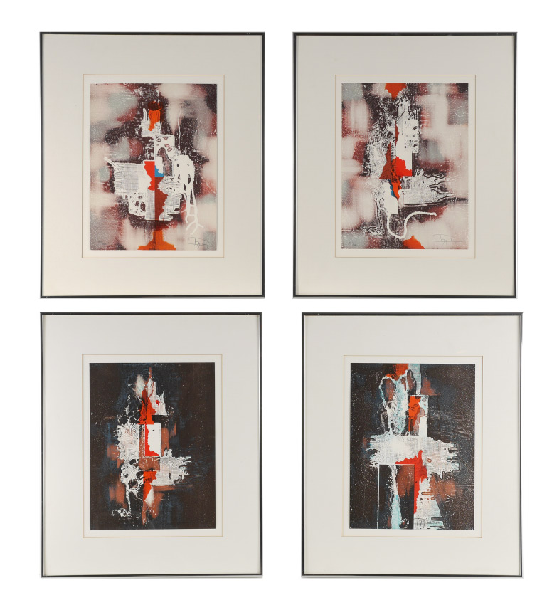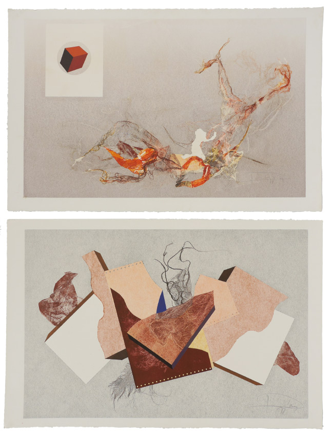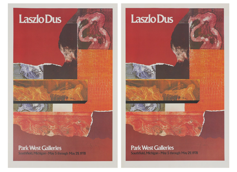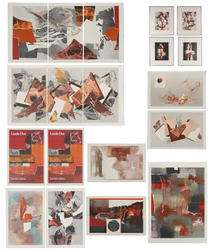 DUS, Laszlo, (Hungarian, 1941-): 9 Etchings and 2 posters, 1) Triptych, ''White Opening 3'', 40'' x 26.5'' each plate, one piece signed lower right, unframed; 2) 2 Laszlo Dus Park West Exhibition posters, 38'' x 25.5''; 3) Diptych, Abstract Composition, 40'' x 26.5'', pencil signed; 4) Triptych, ''Negs fehr hassan(?)'' 40'' x 26.5'', pencil signed; 5) Evszaklk Te'l II, 40'' x 26.5''; 6) Viiagras II (?), 40'' x 26.5''; 7) Hajnali Ebredes III, 40'' x 26.5''; 8) Abstract Composition, 40'' x 26.5''; 9) Nyugalom X, 40'' x 26.5''; 10) Untitled Abstract Composition, 40'' x 26.5''; all unframed.