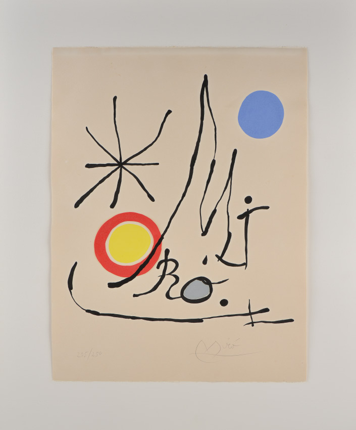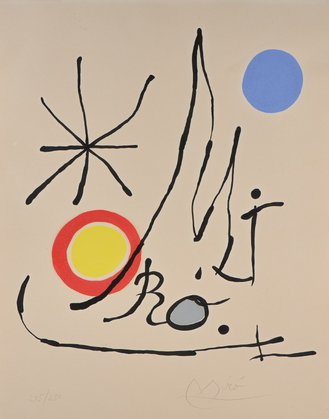 LITHOGRAPH AFTER JOAN MIRO: Composition with Script and Blue Moon, lithograph, 26'' x 19.75'', pencil signed lower right, numbered 235/250 lower left, on arches paper, framed, 35'' x 29.25''.