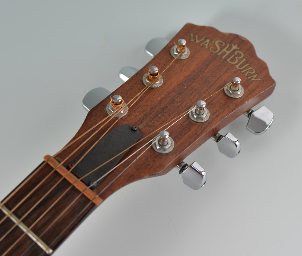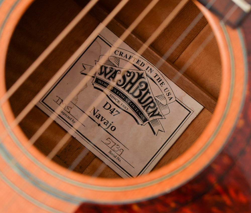WASHBURN D47 NAVAJO ACOUSTIC GUITAR: Part of the Native American series by Washburn, model D47, serial number 5739, inlaid trim on ribs and line down back. Back measures 19 3/4'', overall 40'' h. x 15 3/4'' x 4 1/2''.