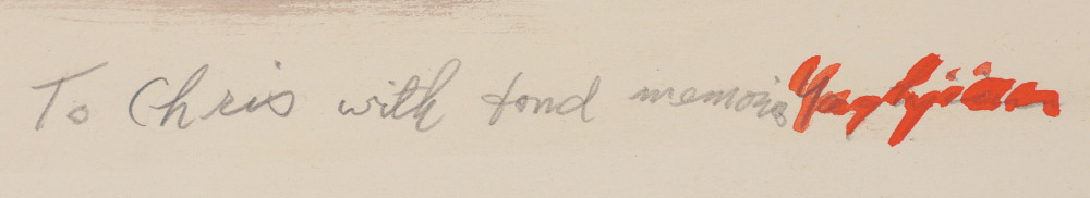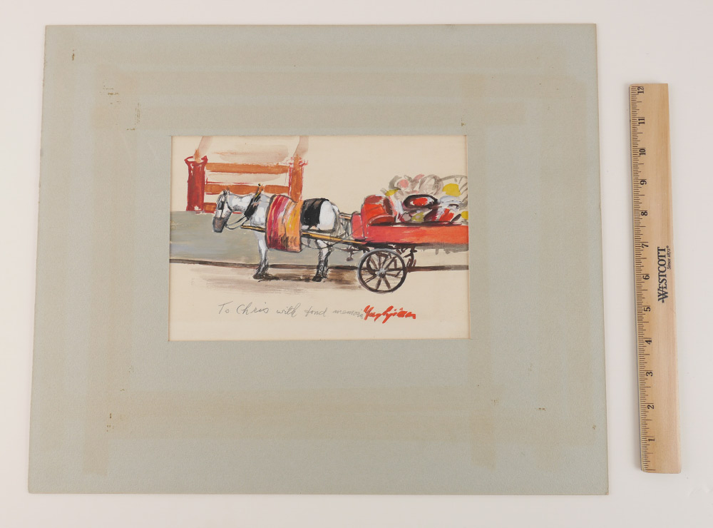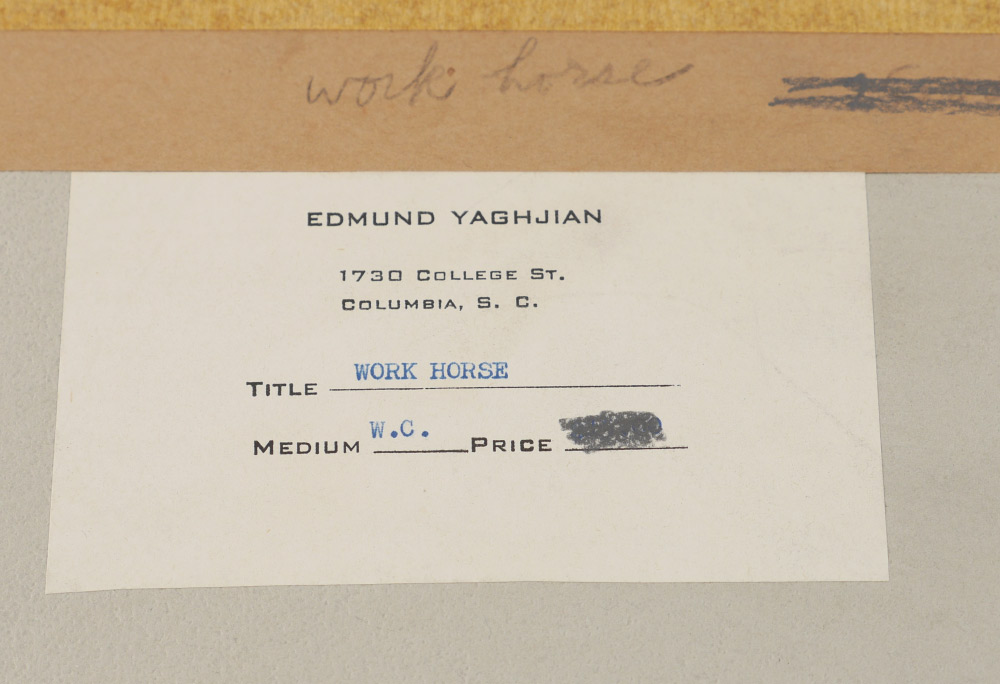 YAGHJIAN, Edward, (Armenian/American, 1903-1997): ''Work Horse'', Watercolor, 6.5'' x 9.5'', signed and dedicated in the lower margin ''to Chris with fond memories'', artist's label attached verso, matted 15'' x 18''. ''Yaghjian was a student of John Sloan and Robert Henri at the Art Students League in New York, and his work has the same spirit as the Ash Can School of painters. The colors orange and turquoise are often included in his works.'' - askART. Provenance: Estate Collection of Christian Buchheit.