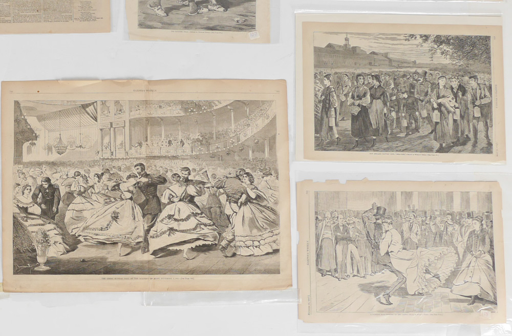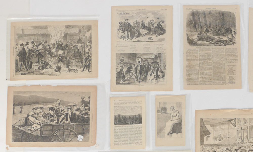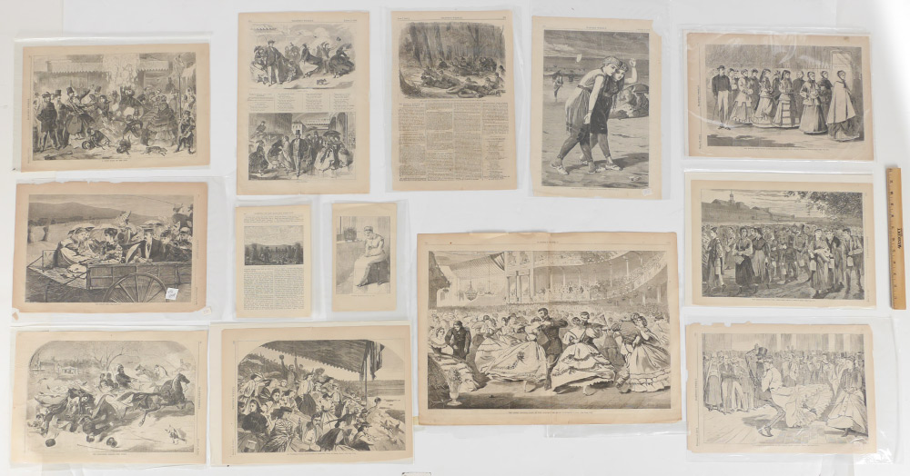 13-PIECE WINSLOW HOME ENGRAVING LOT: 1) ''A Parisian Ball'', 10.75'' x 15.75''; 2) ''The Straw Ride'', 11.25'' x 16.25''; 3) ''The Bathers'', 16'' x 11.25''; 4) ''The Sleighing Season'', 11'' x 15.75''; 5) ''A Snow Slide in the City'', 10.75'' x 15.75''; 6) ''New England Factory Life - Bell Time'', 10.75'' x 15.75''; 7) ''Our Watering Places - Horse Racing at Saratoga'', 11.25'' x 15.75''; 8) ''The Morning Walk - Young Ladies' School'', 10.75'' x 15.75''; 9) ''April Showers'' (1859), 16'' x 11.25'' with margins, 6'' x 9''; 10) ''George Blake's Letter'', 9'' x 5.25''; 11) ''Pumpkins Among the Corn'', 9.5'' x 6.25''; 12) ''Army of the Potomac, Our Outlying Picket in the Woods'', 16'' x 10.25''; 13) ''The Great Russian Ball at the Academy of Music'', double page, 16'' x 21.75''.