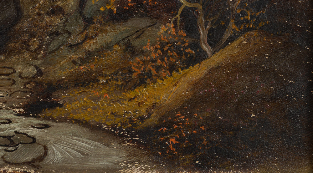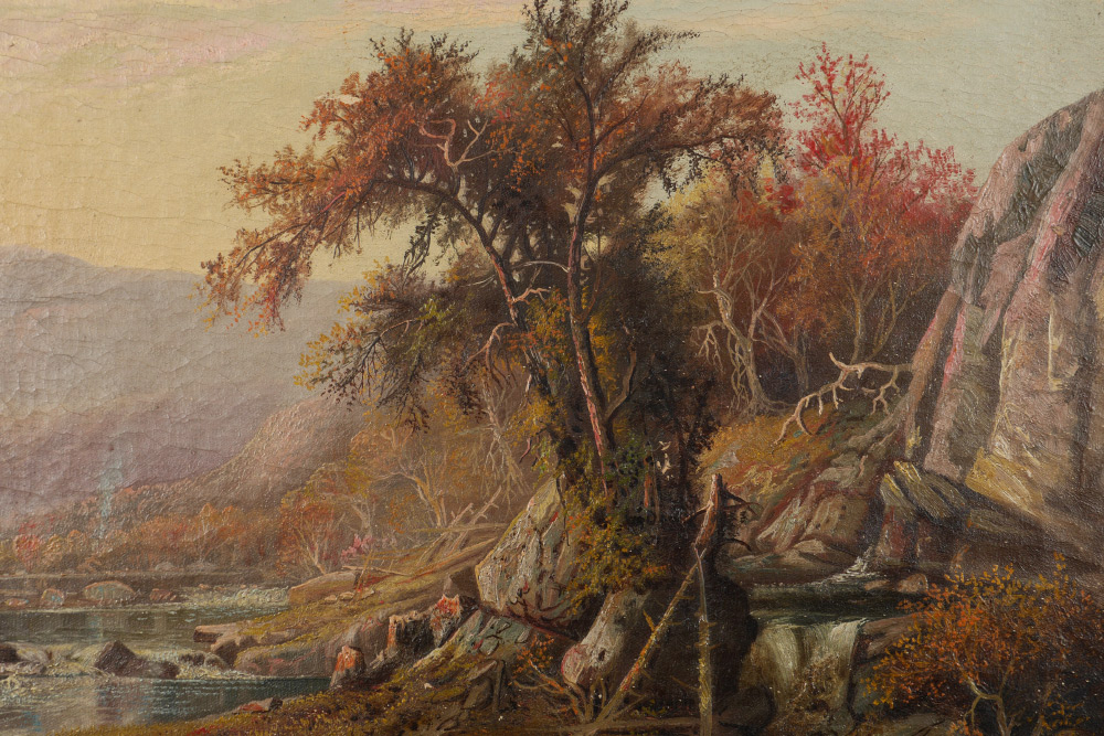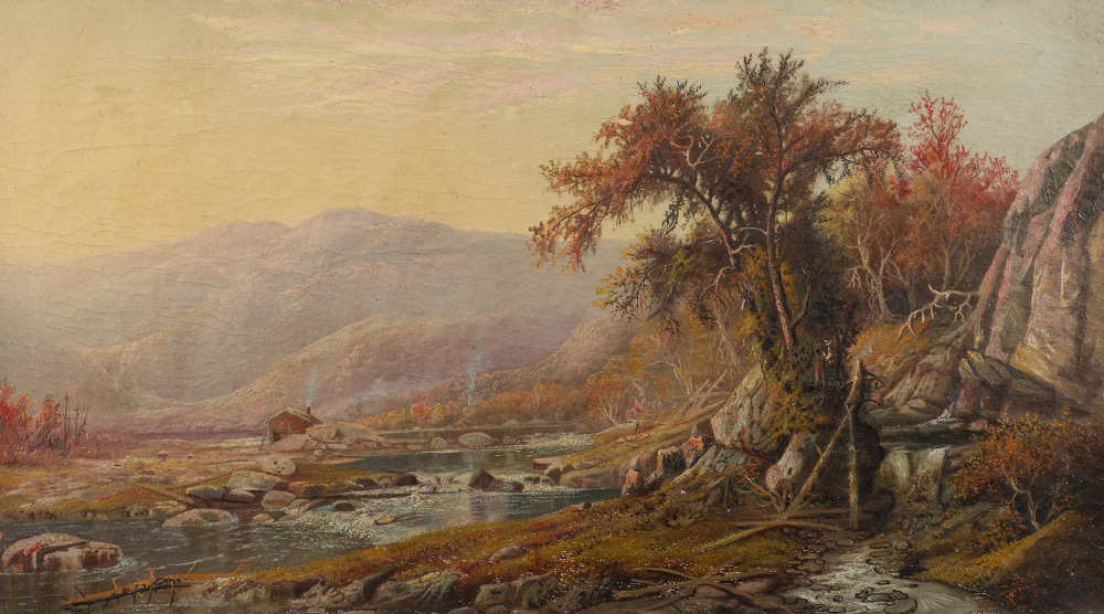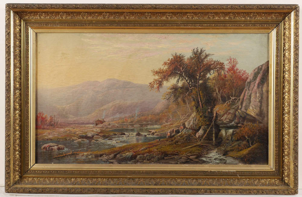 GOOD 19TH CENTURY RIVER LANDSCAPE PAINTING: English or Possibly American, Autumnal River Valley Scene with Cabin on the River, Oil on Canvas, 17'' x 30'', no visible signature, gilded gesso frame, 23.25'' x 36''.