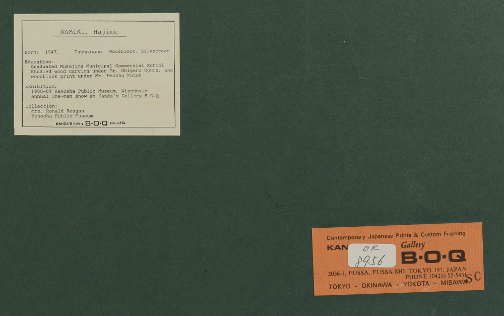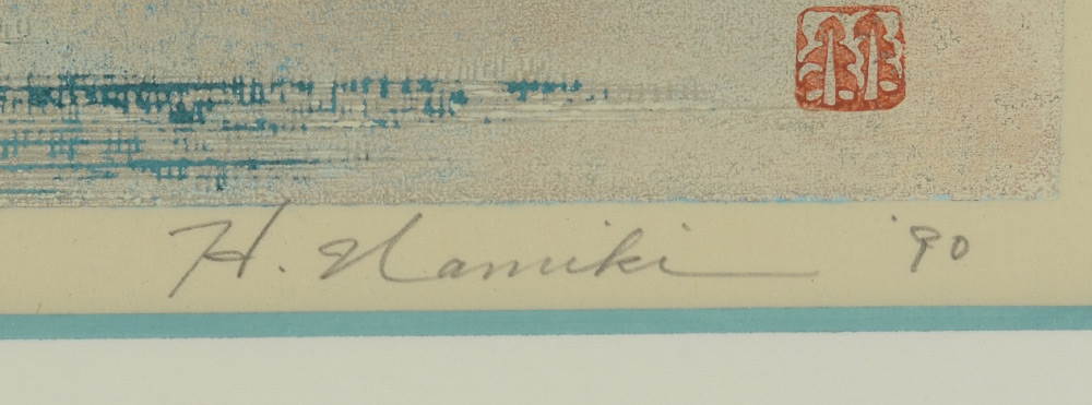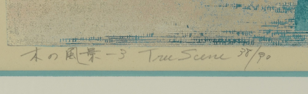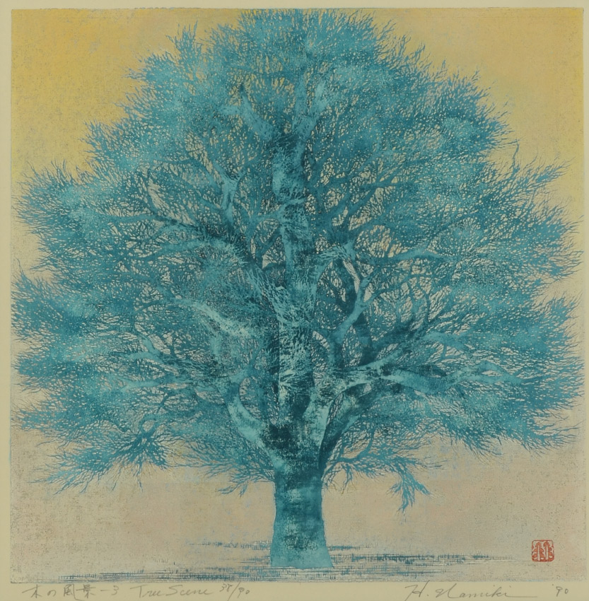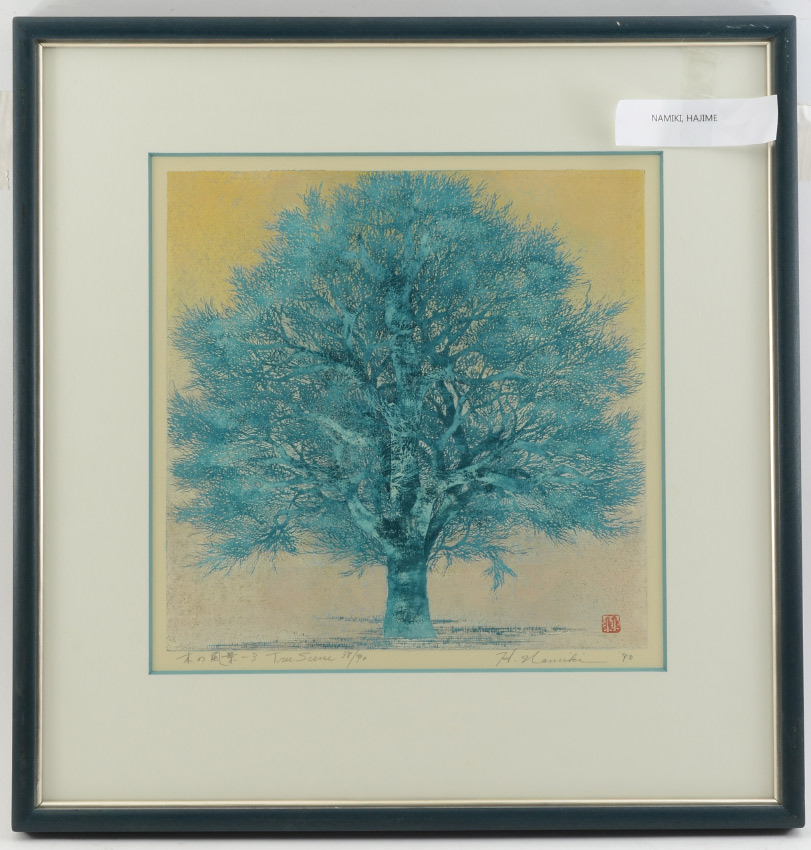 NAMIKI, Hajime, (Japanese, 1947-): Tree Scene, Woodblock Print, 12'' x 12.25'', pencil signed lower right, dated '90, numbered lower left 38/90, custom Kanda B.O.Q. frame, 19.25'' x 18.75''.