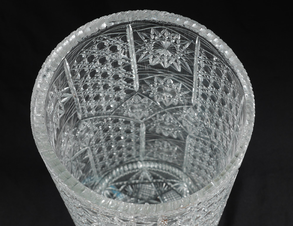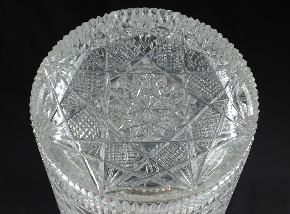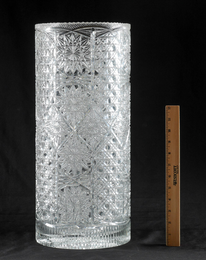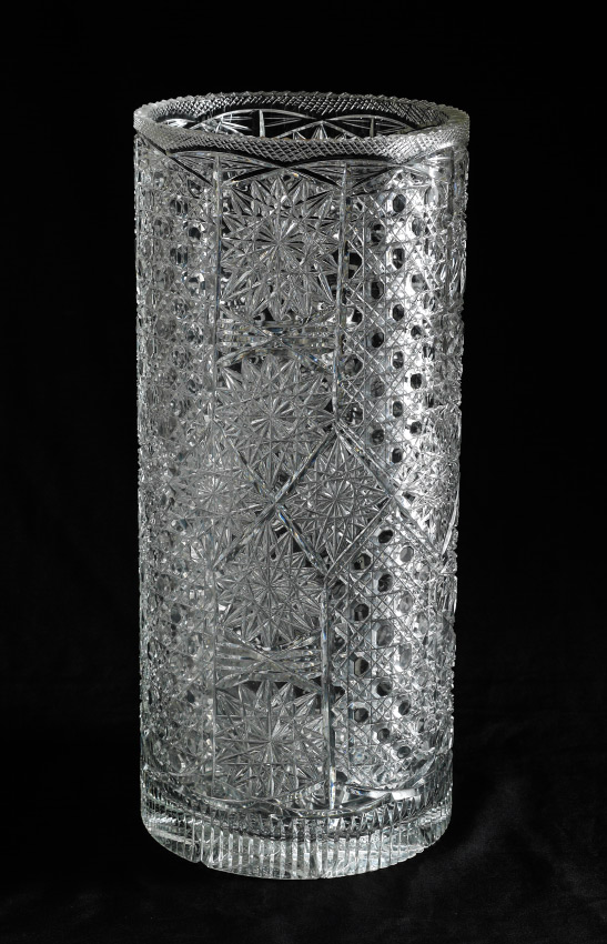 CUT GLASS UMBRELLA STAND: Cylindrical form, nice mix of patterns to include Oct. Hobnail, Diamond and Pinwheel, no signature found, .5'' thickness to glass, 19.5'' h. x 9.625'' dia.