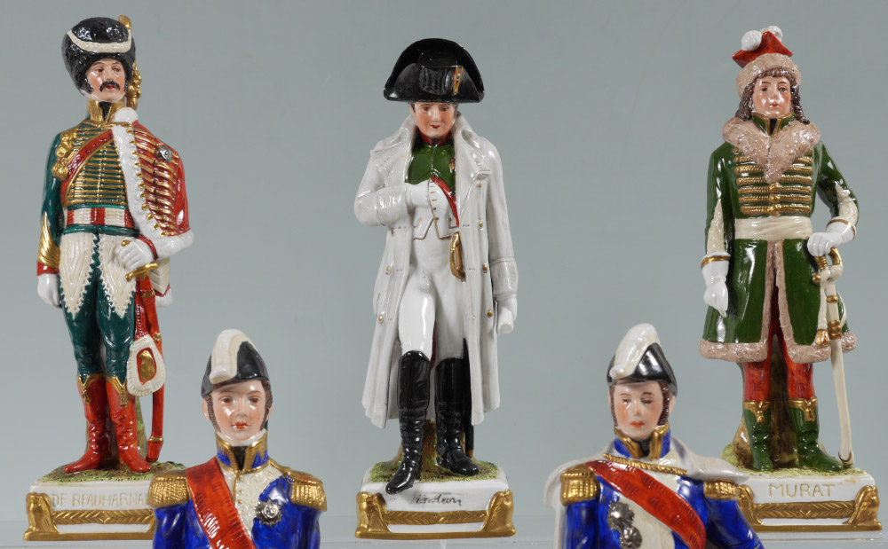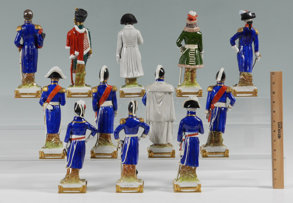 12 SITZENDORF PORCELAIN FIGURINES of NAPOLEON AND HIS GENERALS: 12 pieces total, each marked with Sitzendorf mark, to include a figure of Napoleon and 11 of his generals. Napoleon measures 9 1/4'' h. x 3'' x 3''. CONDITION: No condition issues noted.