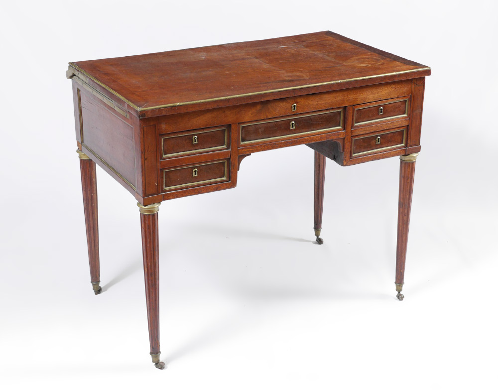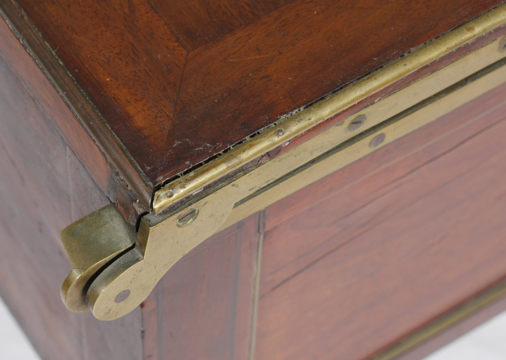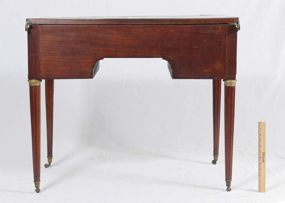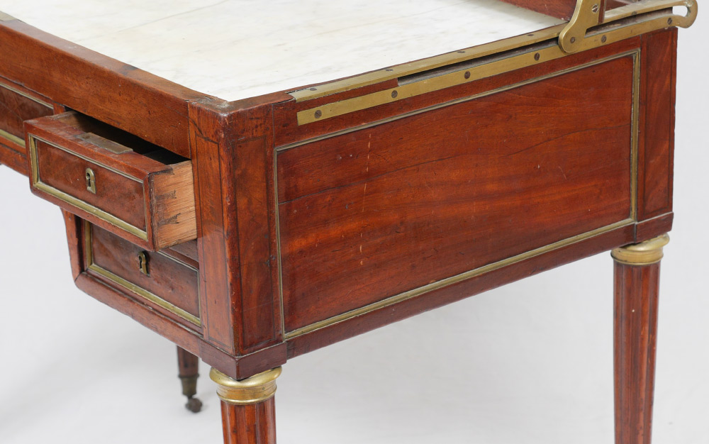 FRENCH MAHOGANY HINGED TOP VANITY WITH MARBLE: Mahogany hinged lift top lid with brass trim, interior mirror on lid, inset marble top. Center drawer with 2 side drawers right side, single deep drawer left, fluted legs ending in castors. Overall measures 30'' h. x 35 1/4'' x 22''. Provenance: Estate of Yves Georges Prade