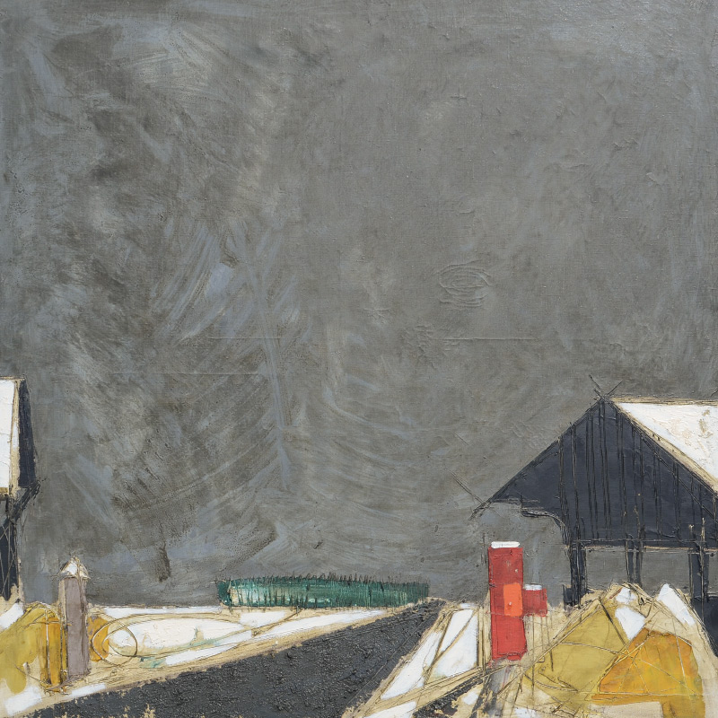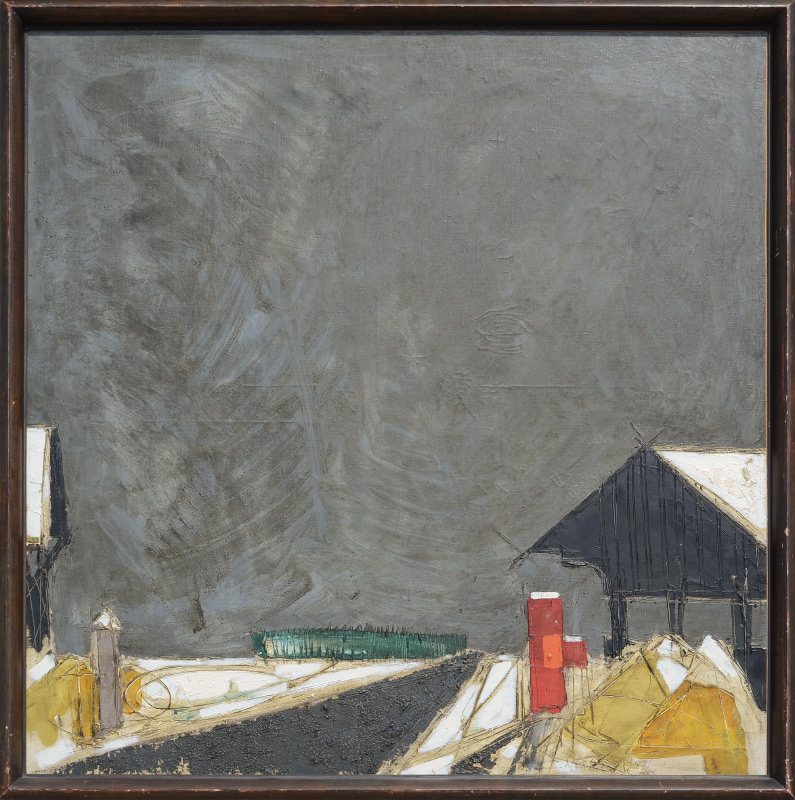 VENARD, Claude, (French, 1913-1999): Landscape with Road and Depot, Oil/Canvas, 39.5'' x 39.5'', signed lower right, frame 42'' x 41.75''. After the height of World War II, Venard began to experience vast recognition for his work. His bold use of color and post-Cubism composition has brought such attention to his work that he has been shown in Paris, London, New York, Philadelphia, Chicago, Germany, Tokyo and Canada, just to name a few.