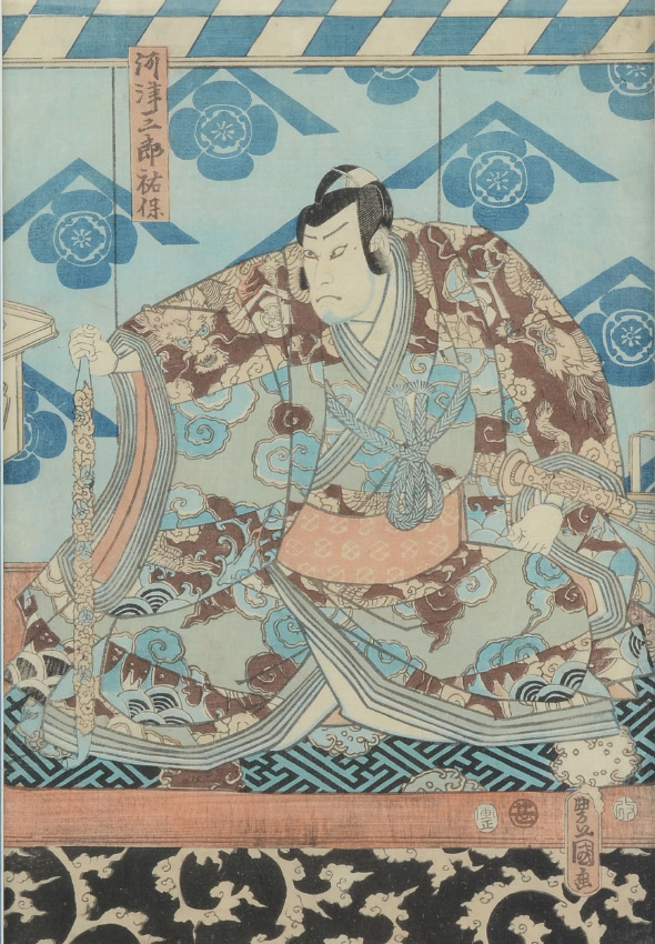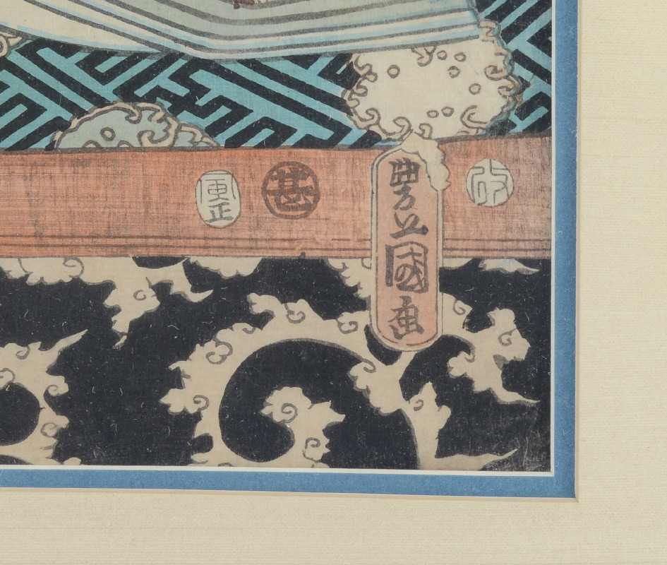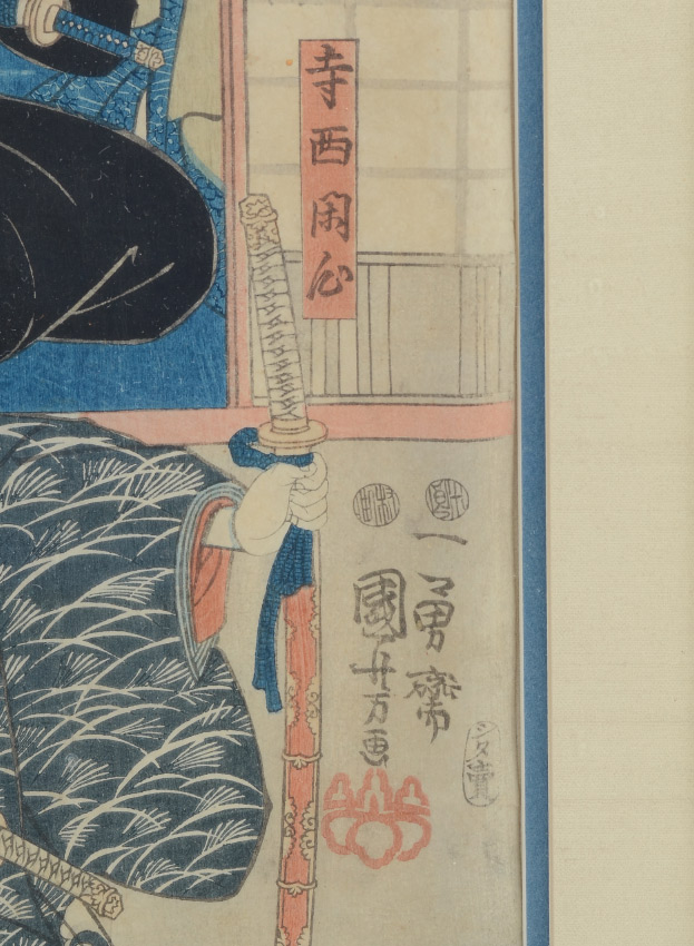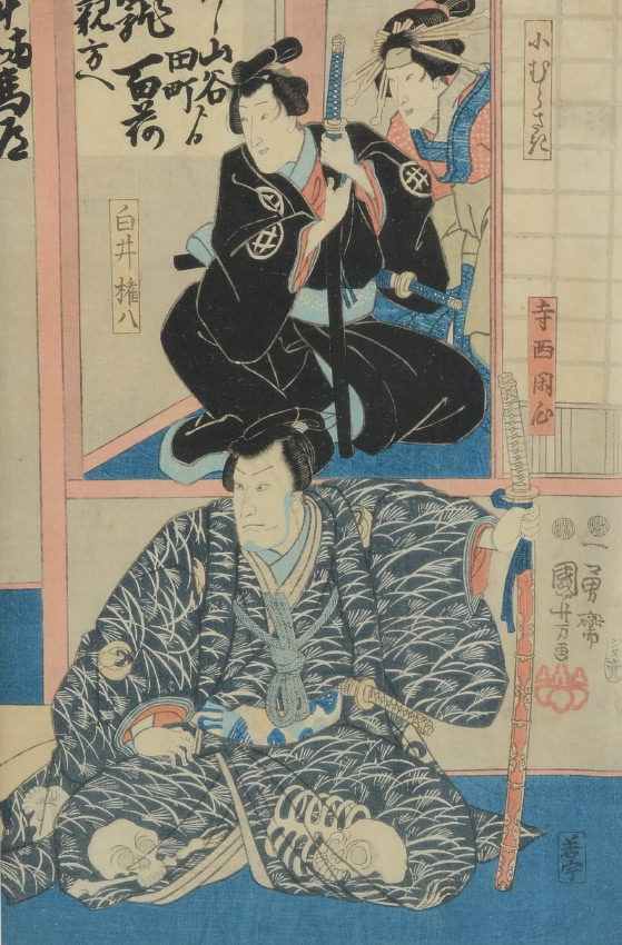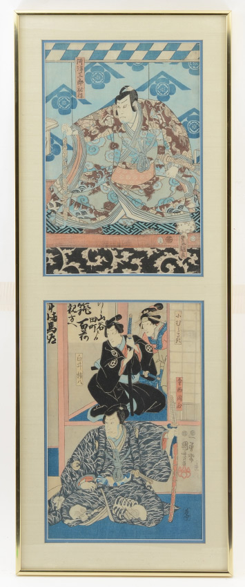 2 JAPANESE WOODBLOCK PRINTS: 2 prints in one frame, each depicts kabuki actor scenes, 13.75'' x 9.25'', overall framed measurement is 34.5'' x 13.25''.