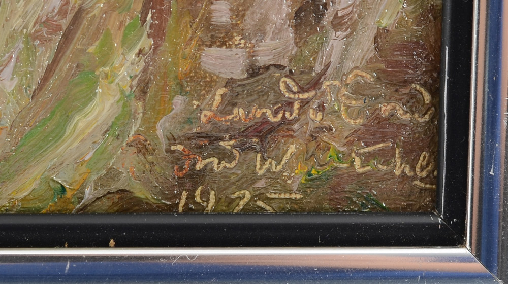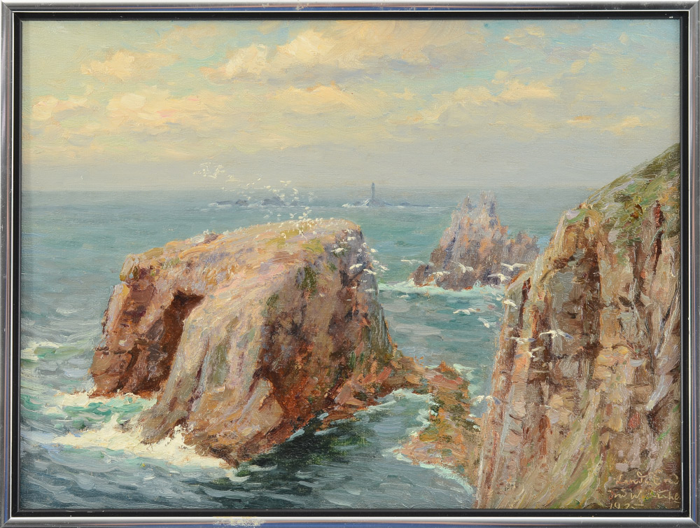 WHITEHEAD, Frederick, (British, 1853-1938): ''Lands End'', Oil on Canvas 9'' x 12'', signed lower right, titled and dated 1925, metal frame 9.25'' x 12.25''. Exhibited at the Spiva Art Center, 1982. Frederick attended the Leamington School of Art and the Academie Julian in the Saint-Denis district of Paris for three years under Jules Joseph Lefebvre and Gustave Boulanger. Whitehead seems to be best known for his paintings of the Dorset countryside. He was a true lover of the English countryside who lived alongside nature in order to observe and immortalize it for future generations.