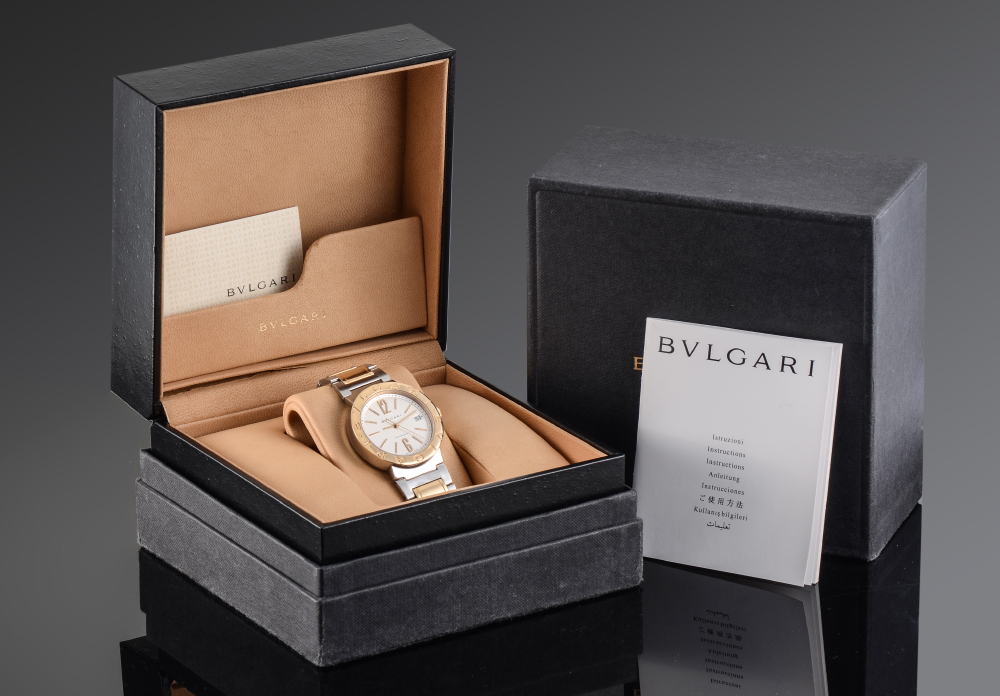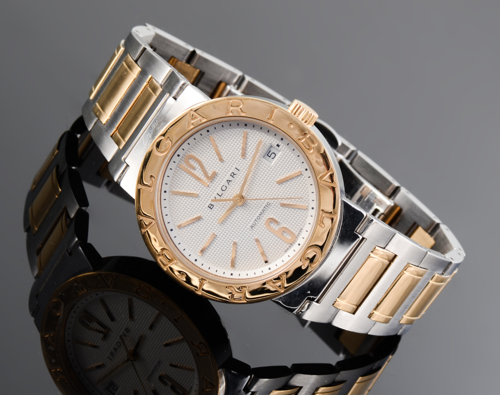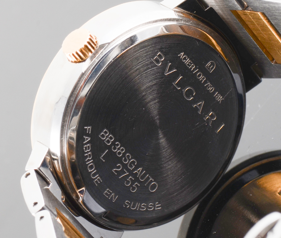 NEW 38MM BVLGARI SS & 18K GOLD MEN'S WATCH: Handsome 38MM Bvlgari Stainless Steel (SS) and 18K yellow gold watch, model #BB 38 SG auto with date display. Logo-engraved 18K bezel, silver dial, three-hand movement, bracelet strap with deployant clasp.
