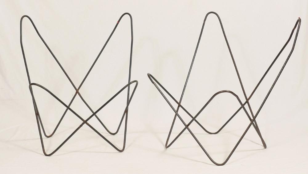 PAIR OF JORGE FERRARI-HARDOY BUTTERFLY LOUNGE CHAIRS: Early to mid-20th century, welded iron frame with original brown leather cover, measure 33 3/4'' h. x 31 3/4'' x 30 1/4''.