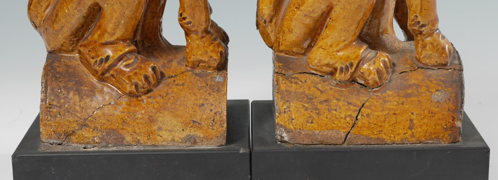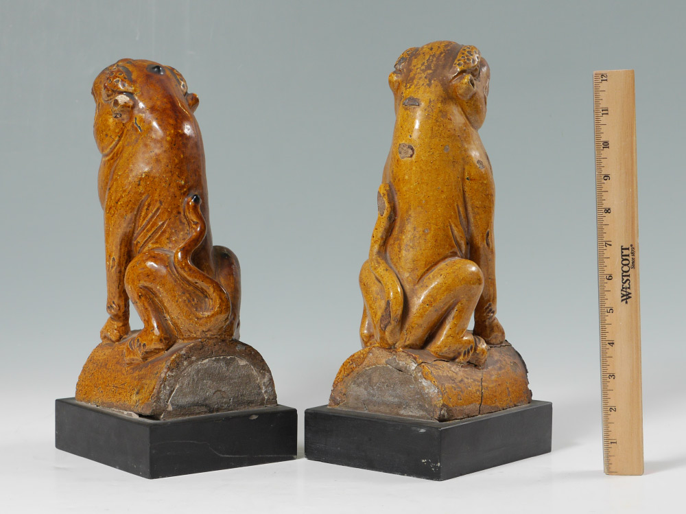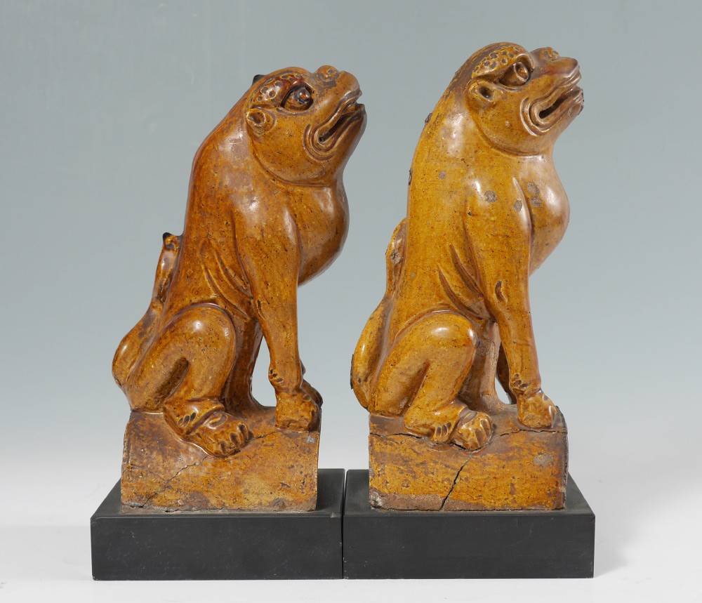 PAIR CHINESE GLAZED TEMPLE LION ROOF TILES: Figural seated temple lions or similar mythological creatures, Sancai yellow glaze, affixed to stone bases. Tiles measure 11'' h., overall 12 3/4'' h. x 6'' x 5 3/4''. Appear to be early, but actual age unknown. Provenance: Estate of Yves Georges Prade