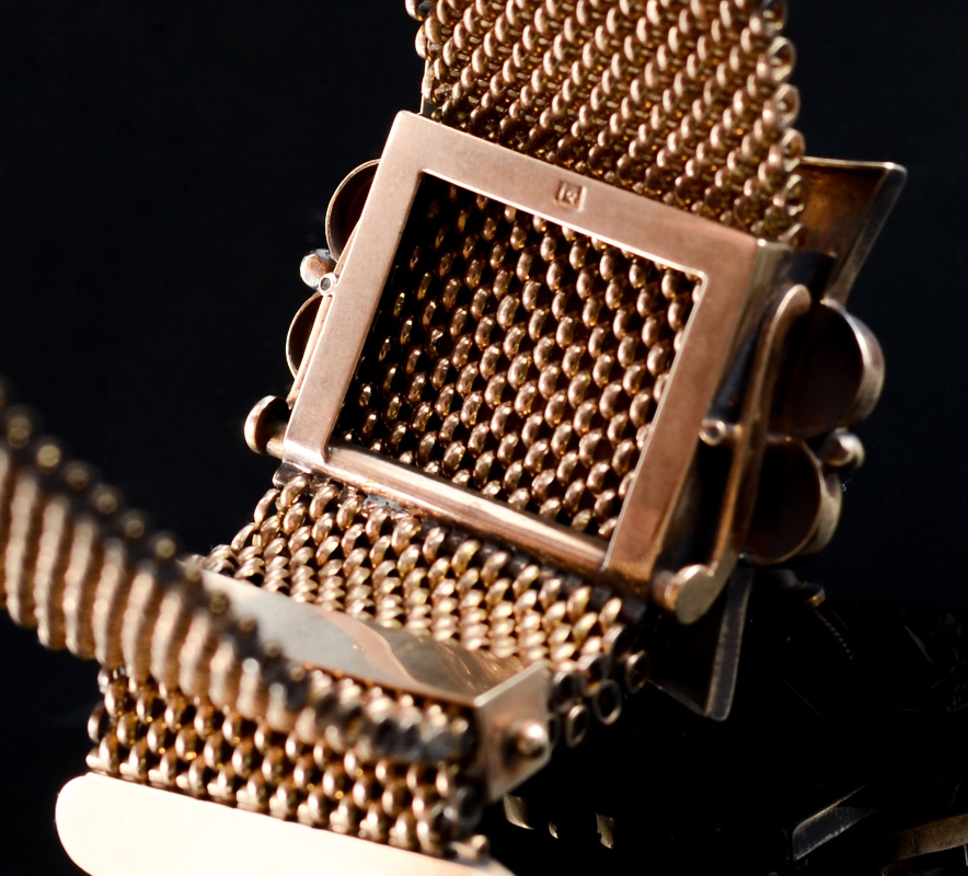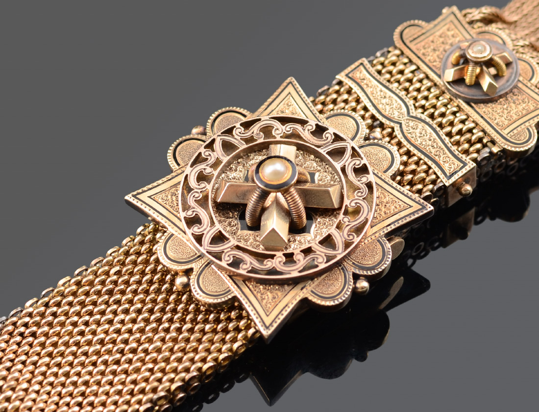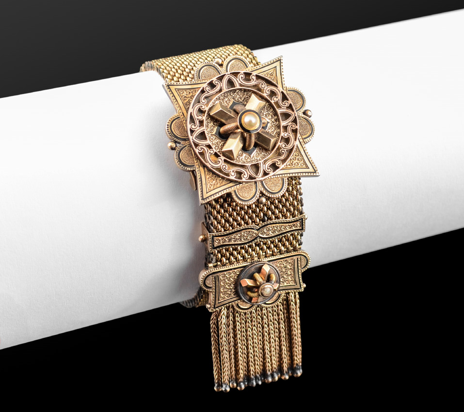 CHARMING 14K VICTORIAN MESH SLIDE BRACELET WITH TASSELS: 14K yellow gold antique slide bracelet from the Victorian era of the late 1800s. A supple mesh bracelet culminating in fringe tassel, adjusts in length by passing under a beautiful slide/clasp crowned by a single pearl. Measures 1'' inch wide and adjusts to 8.5'' inches long (mesh portion only). Marked 14 and weight is 64.2 grams. As a sovereign and a member of the Knights of the Garter, Queen Victoria could not imagine anyone wearing a garter bracelet on her legs so she wore the garter on her arm. This heralded a fashion for garter inspired jewelry that remained popular throughout her reign.