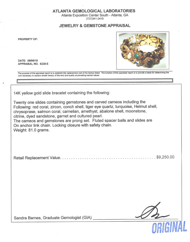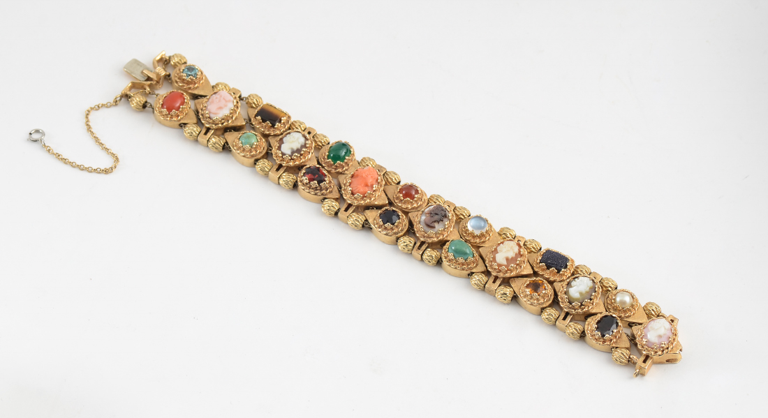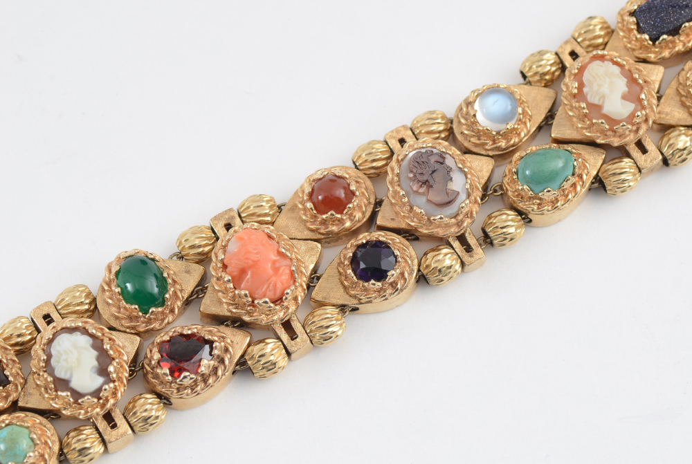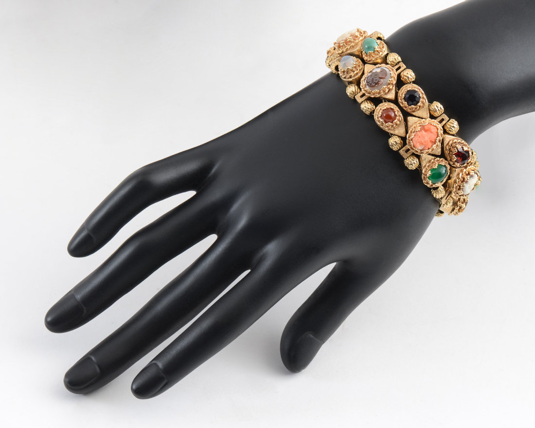 3 ROW 14K MID CENTURY SLIDE BRACELET: 21 slides contain gemstones and carved cameos including red coral, zircon, conch shell, tiger eye quartz, turquoise, Helmut shell, chrysoprase, salmon coral, carnelian, amethyst, abalone shell, moonstone, citrine, dyed sandstone, garnet and cultured pearl. Fluted spacer balls and slides are on an anchor link chain. Locking closure with safety clasp. 7'' long and .5'' wide. Sold with current Atlanta Gemological GIA graduate's appraisal for $9,250.