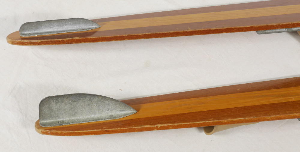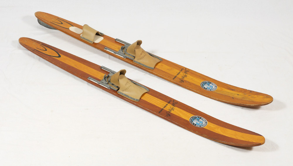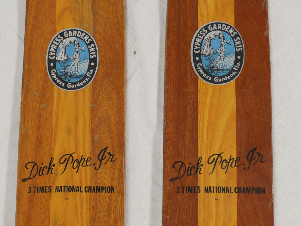 2 VINTAGE CYPRESS GARDENS WATER SKIS: Well used Dick Pope Jr. model skis from the historic Cypress Gardens theme park, now Legoland Florida. Marked with Cypress Gardens label, Dick Pope Jr. 3 Time Champion and Cypress Garden Skis on foot holds. 67'' long x 6 3/4'' x 5''