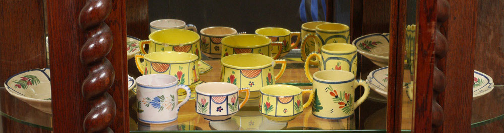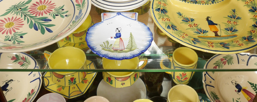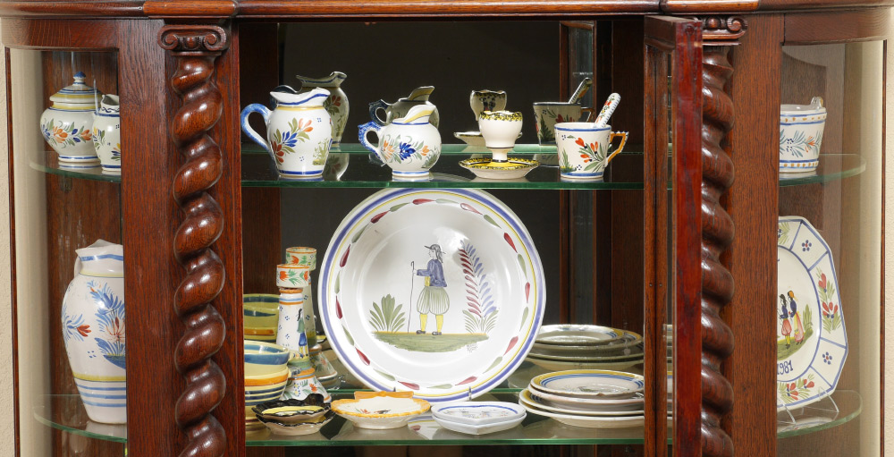 COLLECTION OF FRENCH QUIMPER POTTERY: An assembled collection of approx. 42 pieces of Quimper pottery, various colors, ages, and patterns. To include a pitcher (8 3/4'' h. x 7 1/2''), plates (largest measures 11 1/2''), cups, creamers, sugar, candlestick and more.