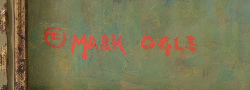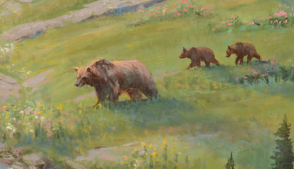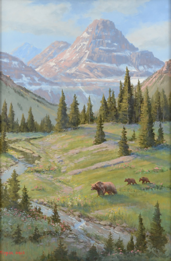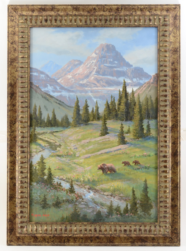 OGLE, Mark (American, 1952-): Expansive Western Landscape with Snow-capped Mountains and a Family of Grizzly Bears in the Foreground, Oil on Masonite, 30'' x 20'', signed lower left, framed, 36.5'' x 26.5''. Mark Ogle was raised and educated in Kalispell, Montana, and began studying art under contemporary artists, including Joe Abbrescia, Robert Cavanaugh and Ace Powell. He specializes in bold, colorful oil paintings and soft pastel watercolors. His work has been on tour by the Smithsonian.