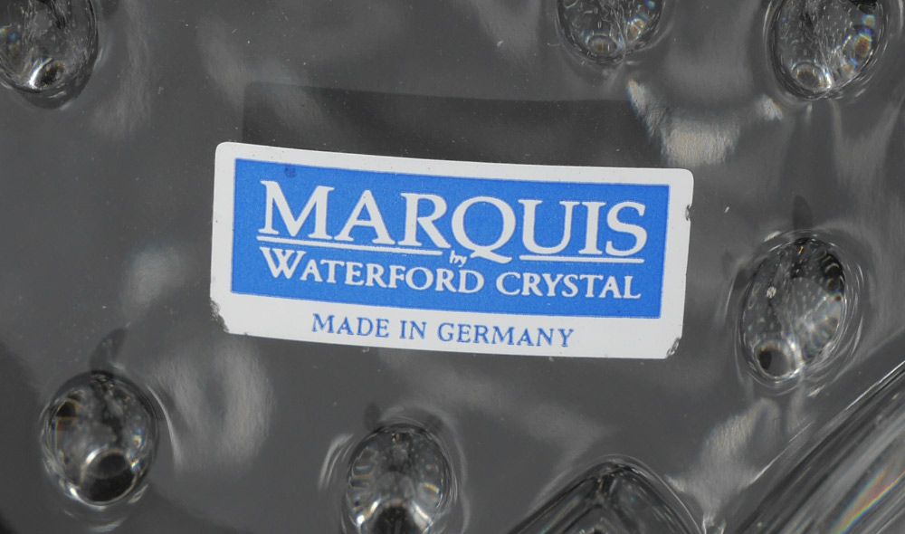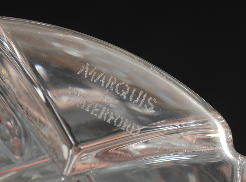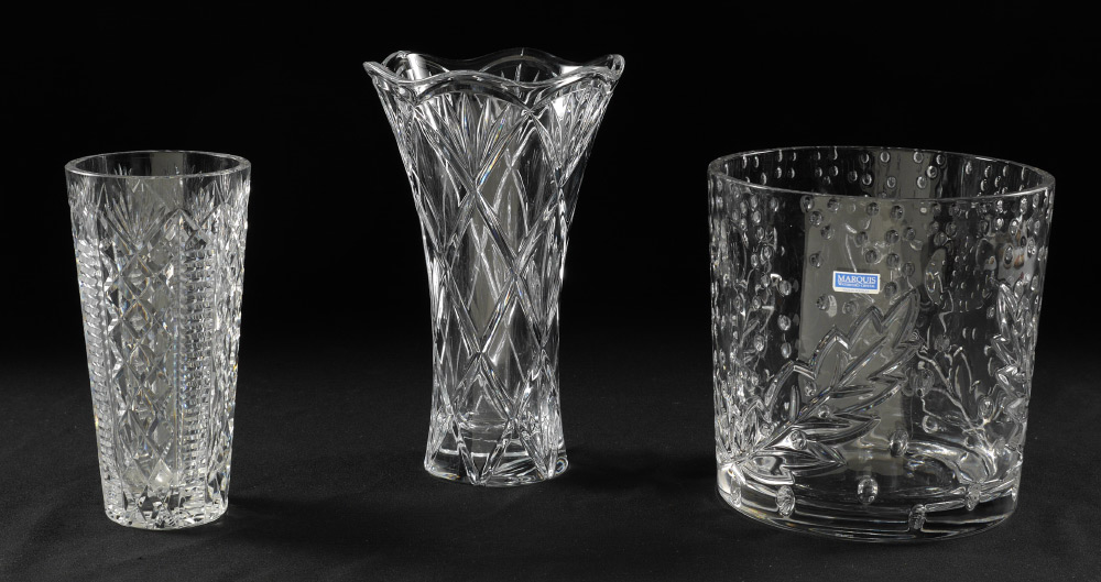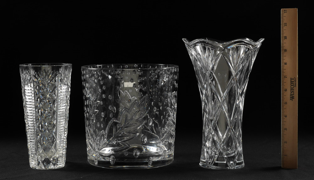 3 PIECE WATERFORD VASES AND BUCKET: 3 pieces total to include 1) Cylindrical vase, 8'' h. x 4''. 2) Marquis vase with shaped rim, 10'' h. x 6 1/4''. 3) Marquis bucket / cooler with leaf designs, 7 1/4'' h. x 7 3/4'' dia.