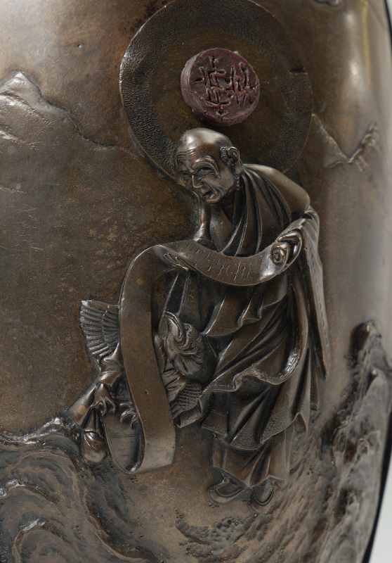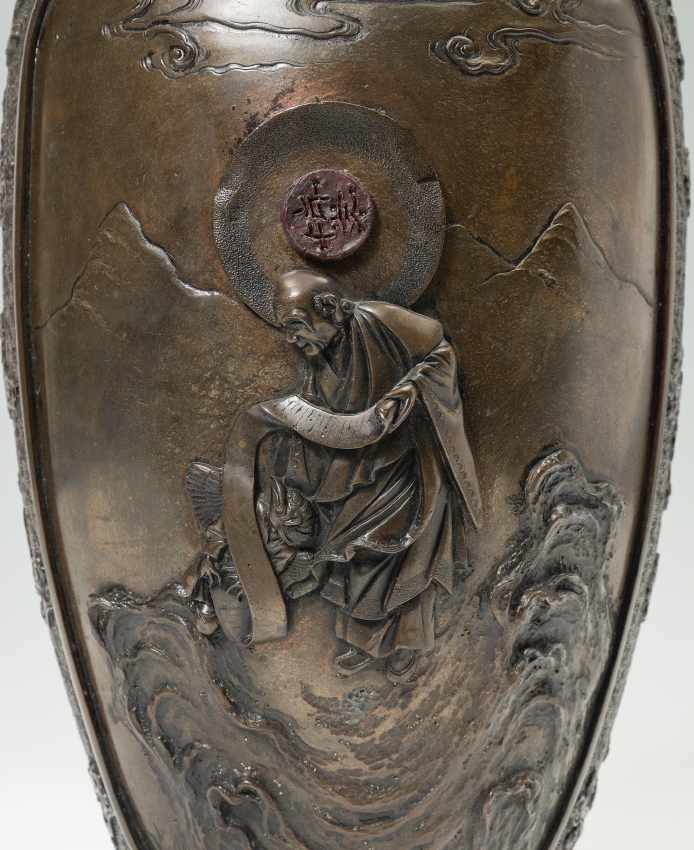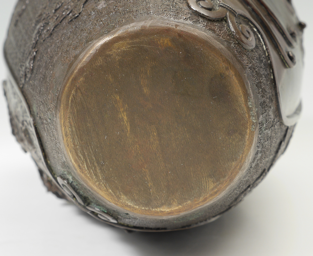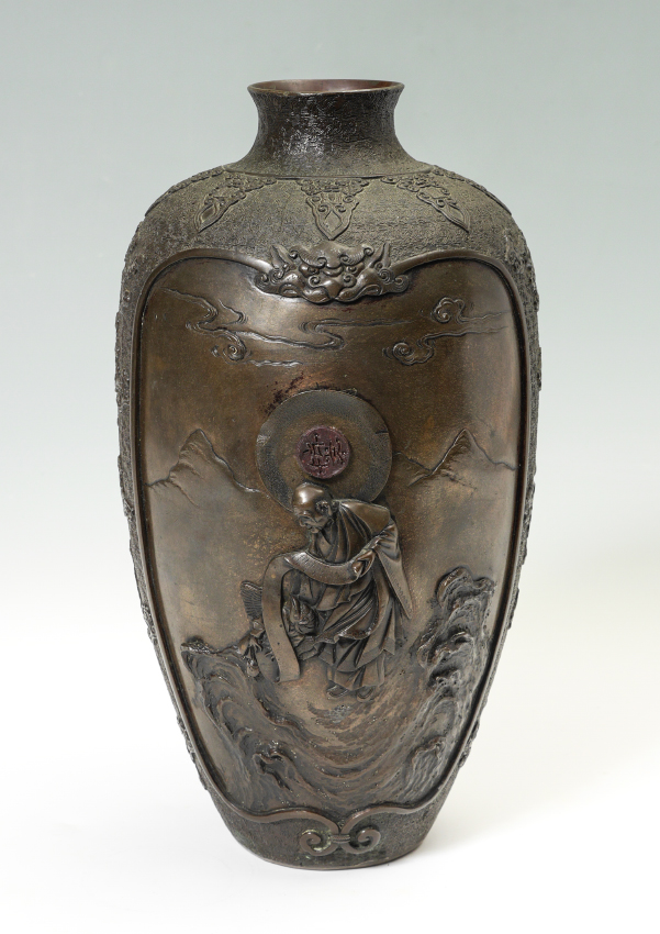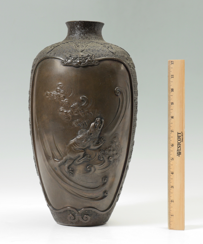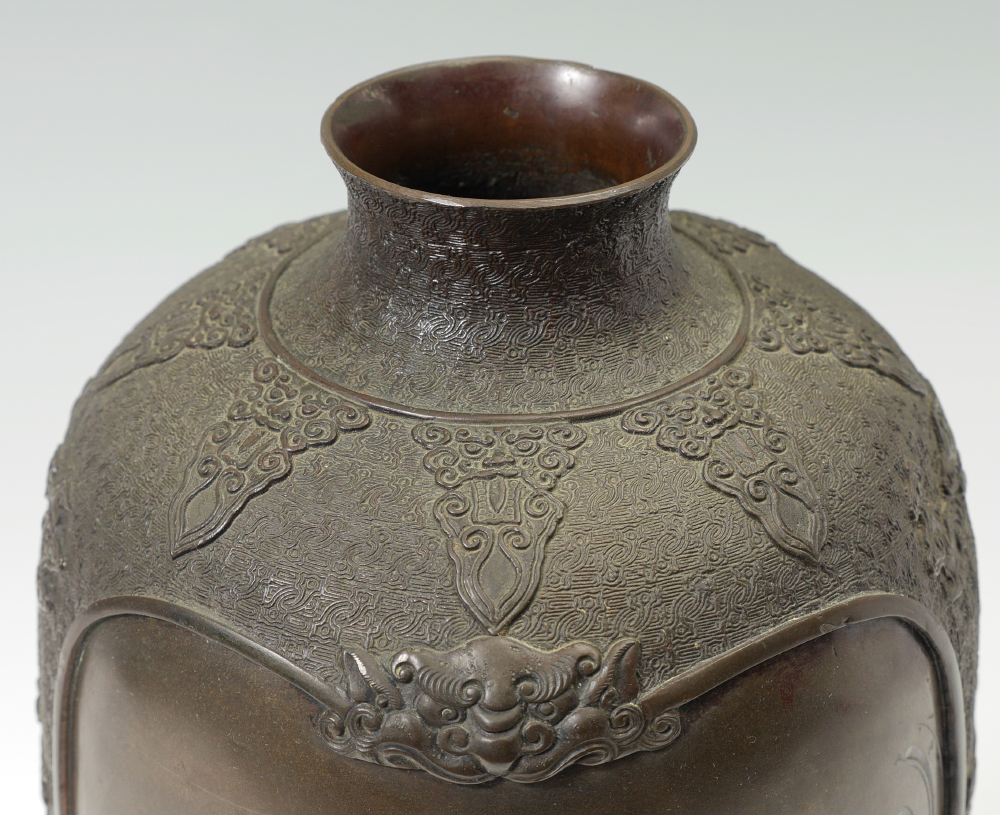 JAPANESE MEIJI PERIOD BRONZE VASE: Nicely executed bronze vase, one panel with scholar and bird in landscape other with mythological creature in clouds. Marked in Kanji on sun in one panel, overall measures 15'' h. x 7 3/4''.