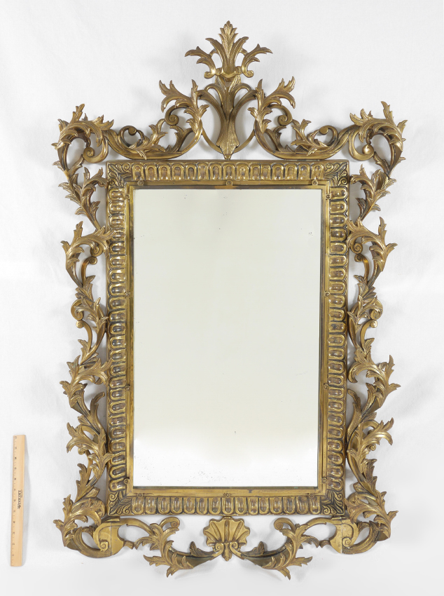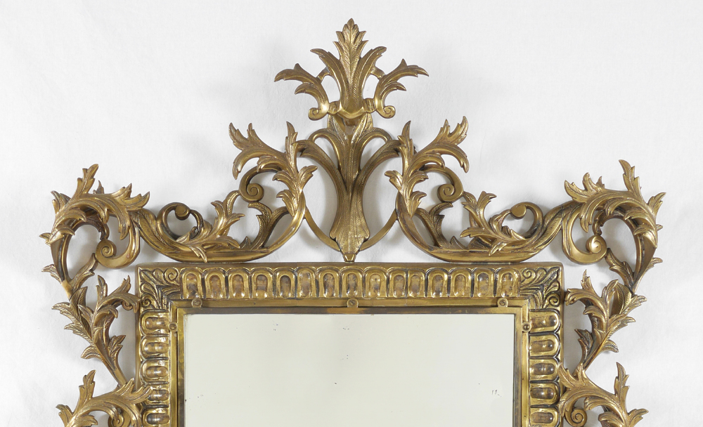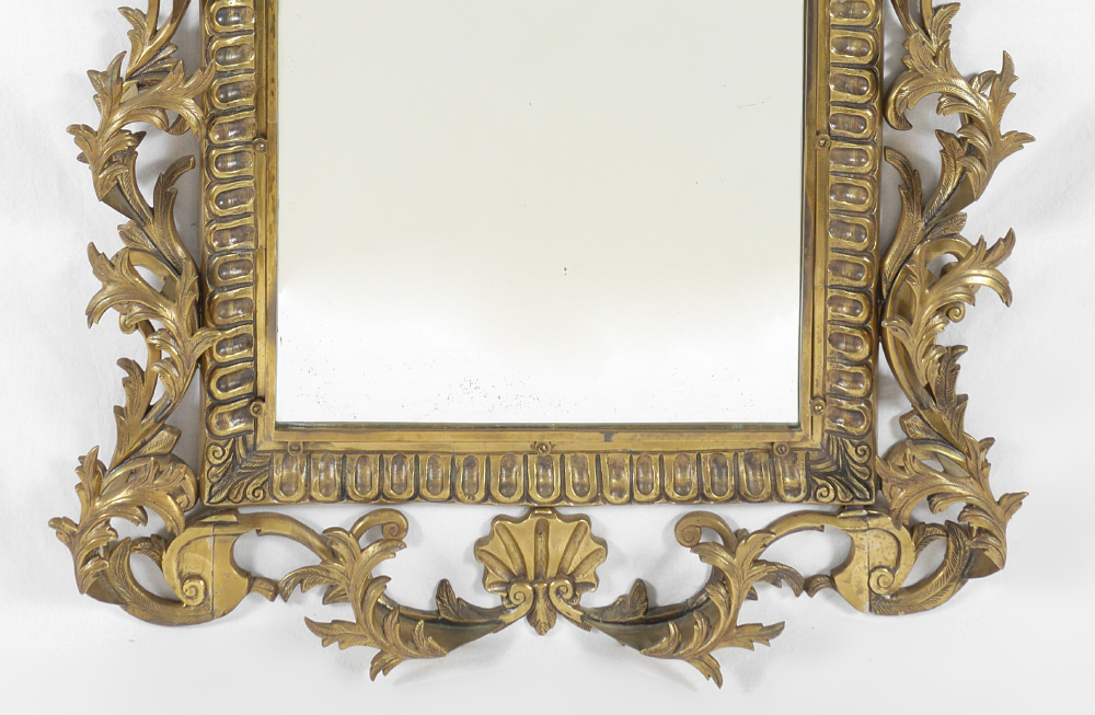 HEAVY BRASS ROCOCO STYLE WALL MIRROR: Large wall with heavy cast brass frame, open foliate scroll motif. Overall measures 53'' h. x 34 1/2'' x 5 1/2''.