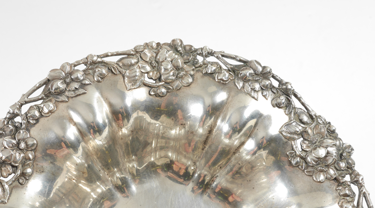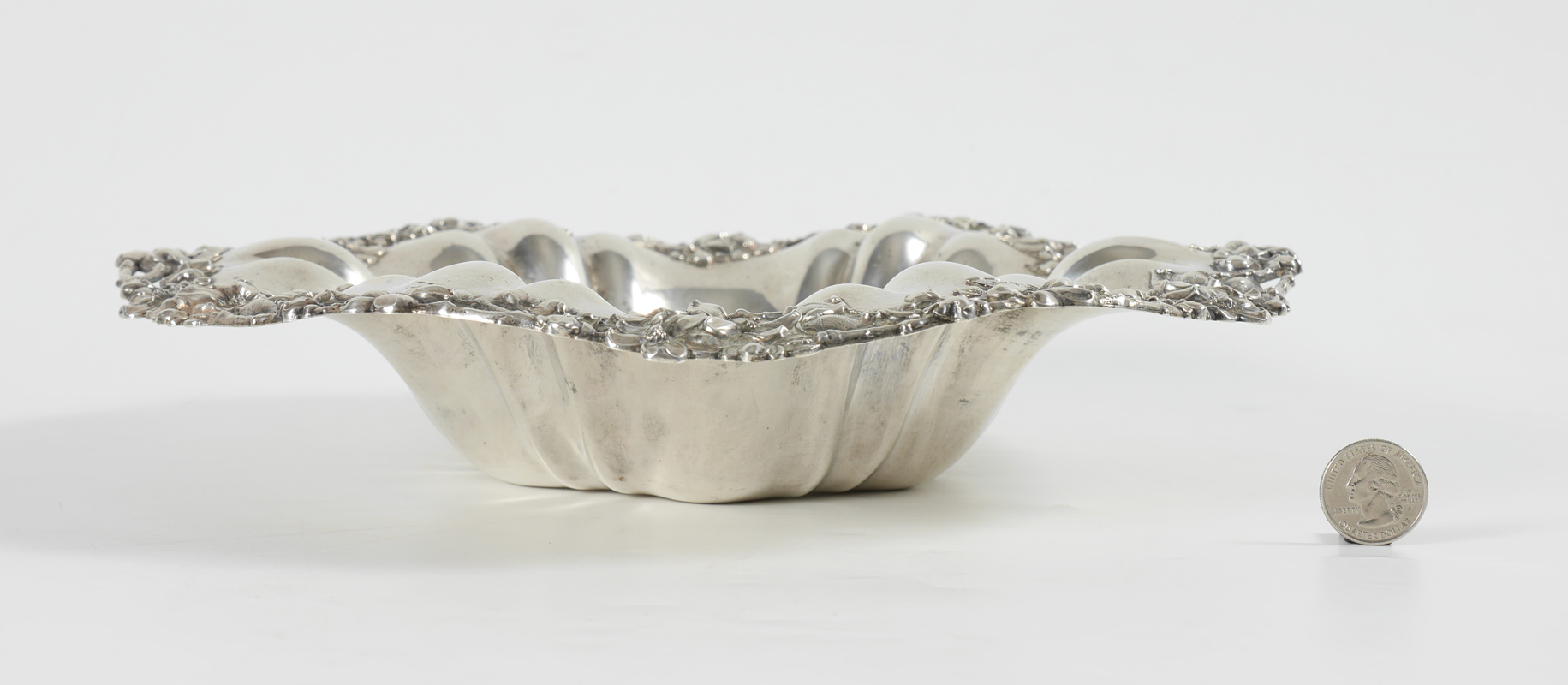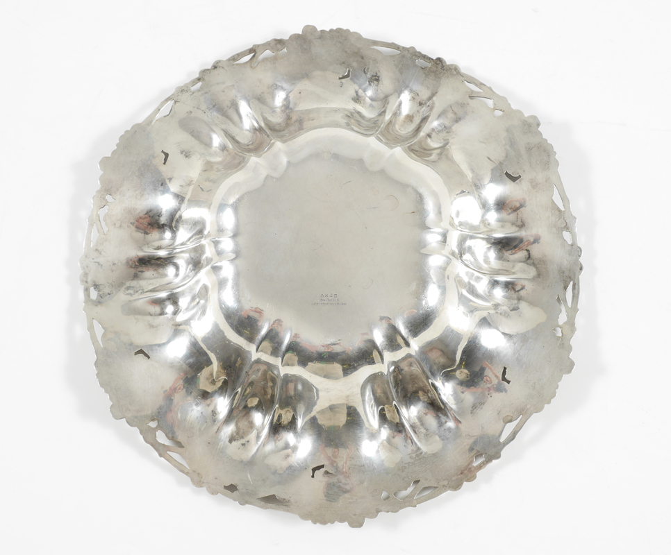 CHESTER BILLINGS & SON STERLING CENTER BOWL: Floral motif reticulated rim, fluted sides, marked on base with retailer's name ''Chester Billings & Son, Sterling, 2780''. Measures 2 1/4'' h. x 12'', approx. 18.6 troy oz.