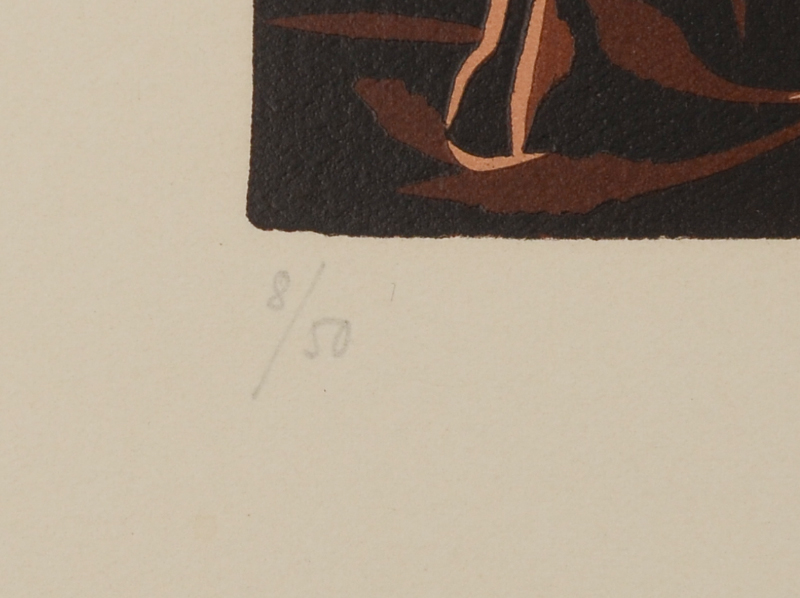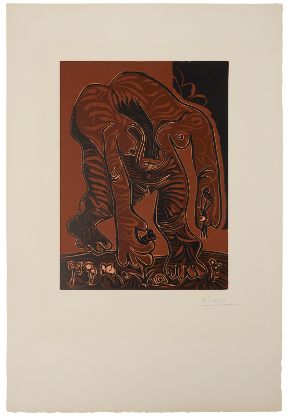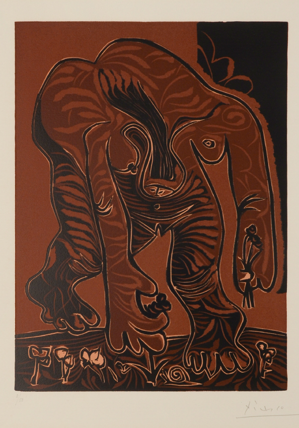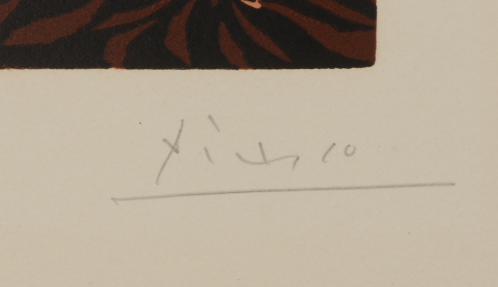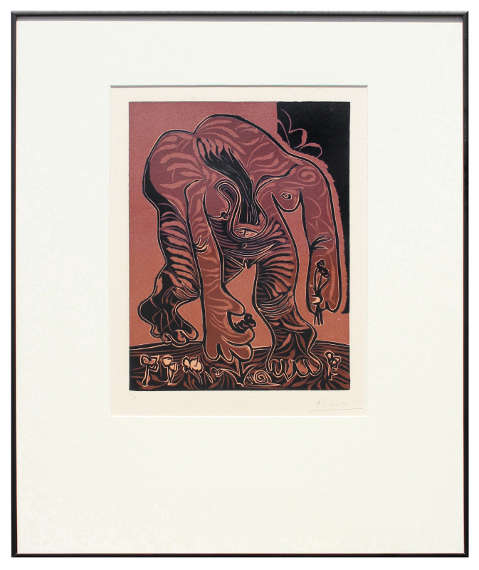 PICASSO, Pablo, (Spanish, 1881-1973): Woman Picking Flowers ''Femme Cueillantes des Fleurs'', Linocut, sight size 15.5'' x12.25'', image size 13.75'' x 10.5'', pencil signed lower right and numbered 8/50 lower left, contemporary frame, 26.25'' x 22.25''. Size with margins 24.5'' x 17.5''. Arches watermark in right margin. ''The Spanish painter, graphic artist and sculptor Pablo Picasso created a body of work of about 50,000 paintings, drawings, prints, sculptures and ceramics. He studied at the Royal Academy in Madrid and at the Art Academy in Barcelona, where his father taught. In 1901 Picasso had his first exhibition in a gallery in Paris, followed by numerous international exhibitions. The works from his Blue and Rose period and the establishing of cubism along with Georges Braque marked the beginning of his extraordinary artistic career.'' '' In honor of Picasso's works, two museums, the Museu Picasso in Barcelona and the Museu Picasso in Antibes, were established during his lifetime. Famous for the diversity of his expressions, Pablo Picasso is one of the outstanding artists of the 20th century.'' Excerpt from AskArt August 25, 2016; http://www.askart.com/artist_bio/Pablo_Picasso/9000079/Pablo_Picasso.aspx.