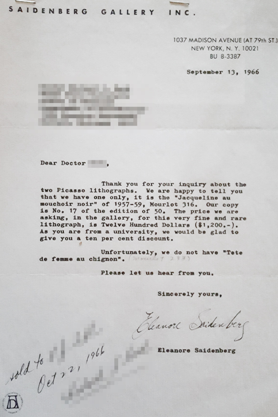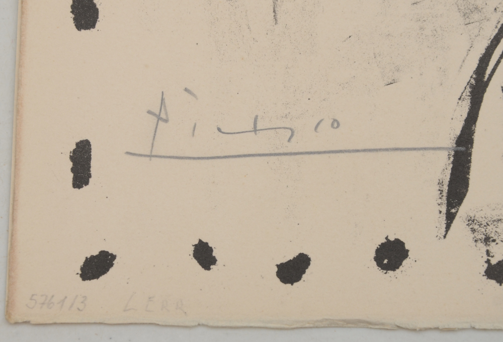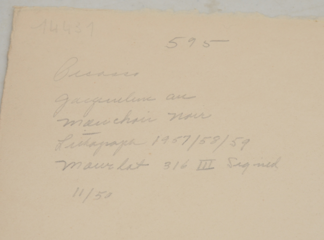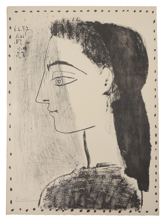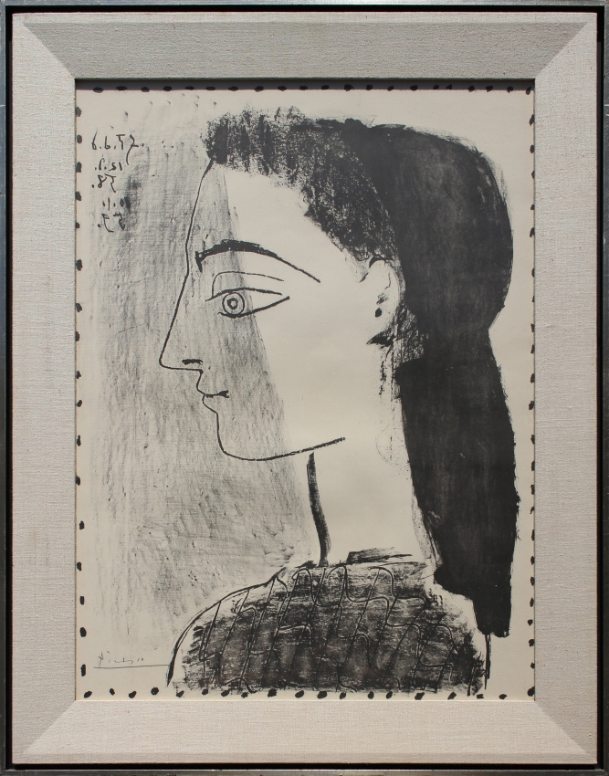 PICASSO, Pablo, (Spanish, 1881-1973): ''Jacqueline au Mouchoir'' Jacqueline with Black Scarf, Second State Lithograph Printed by Mourlot, 1959; Published by Galerie Louise Leiris, 1959; (Bloch 874; Mourlot 316), sight size 25.25'' x 19, pencil signed lower left, numbered 40/50 lower right, contemporary frame, 31.5'' x 25.25''. Full size sheet 26'' x 19.75''. Copy of original receipt from Saidenberg Gallery, 1966.