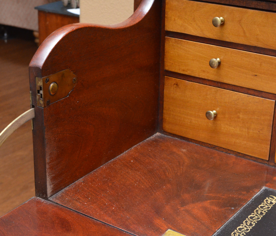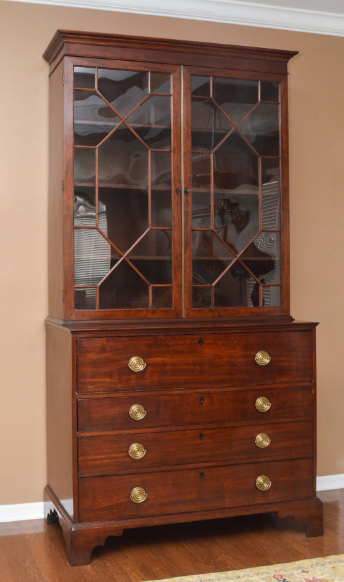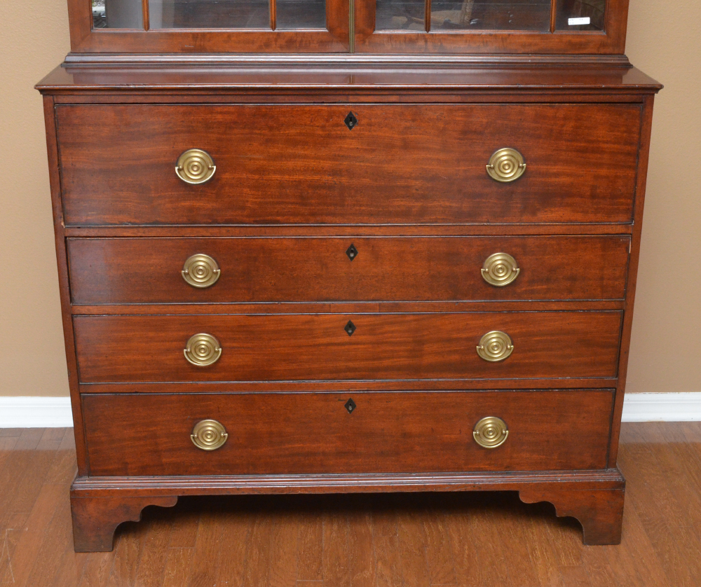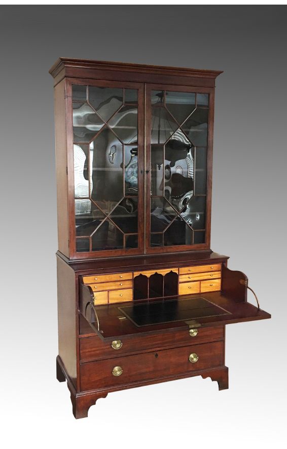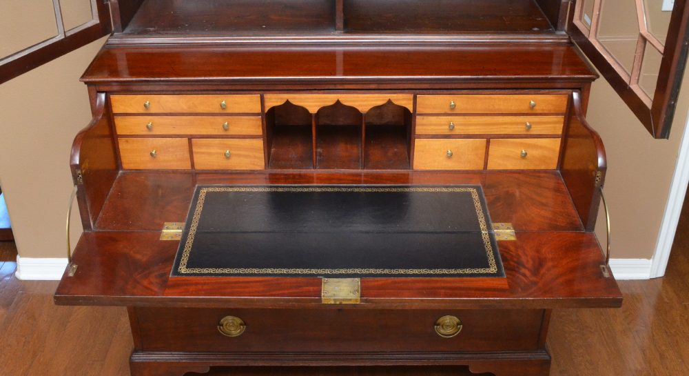18TH CENTURY GEORGE III PERIOD SECRETAIRE BOOKCASE: Fine mahogany case, top bookcase with stepped pediment over 2 fretwork glass doors, 3 internal shelves. Secretary base opens to satinwood interior, valanced pigeon holes, 8 drawers, embossed leather writing surface, over 3 graduated drawers, shaped feet. Overall measures 96'' h. x 47 1/2'' x 22''. Original purchase price, $20,250.00 in 2004