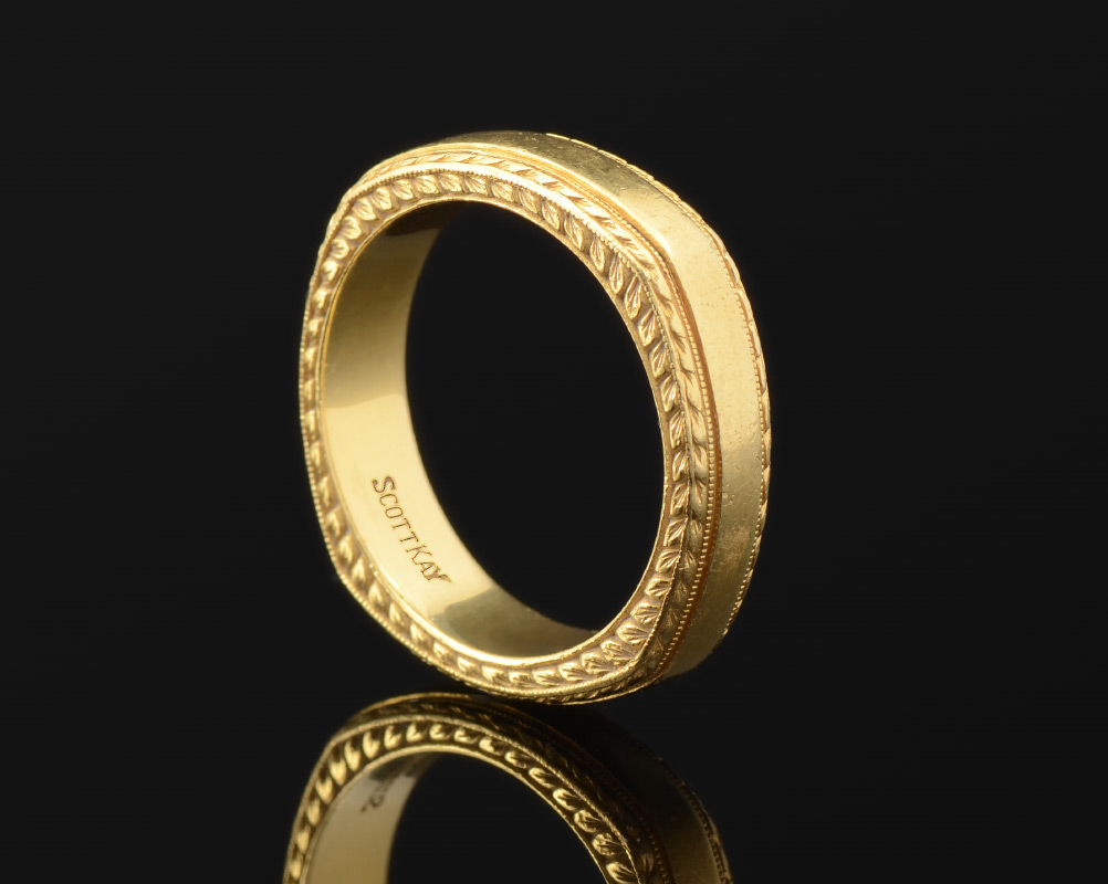 14K SCOTT KAY SQUARE DESIGN MEN'S WEDDING BAND: The unique design sets this yellow gold ring apart. Size 10.5. Total weight 16.0 grams.