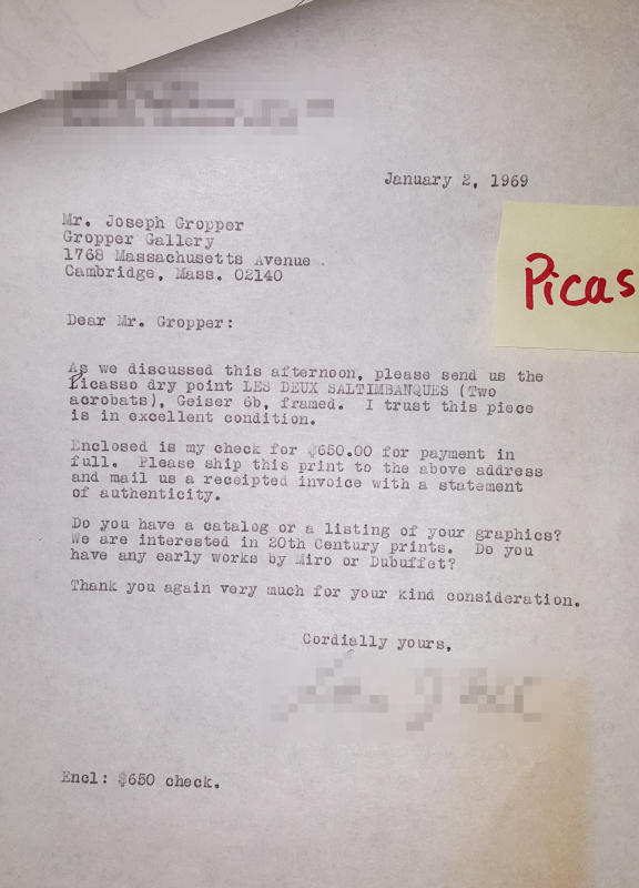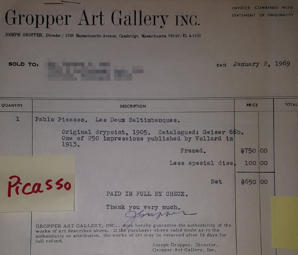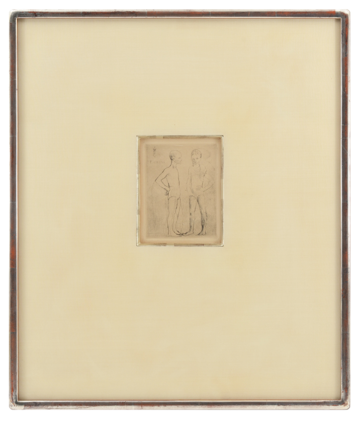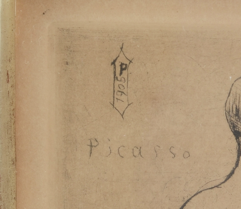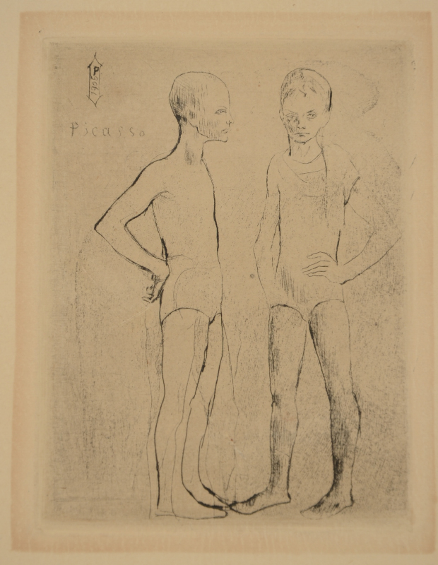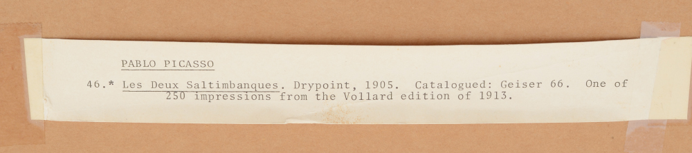 PICASSO, Pablo, (Spanish, 1881-1973): ''Les Deux Saltimbanques'', Dry point, sight size 5'' x 4'' impression size 4.5'' x 3.5'', framed, 20'' x 16.5''. Catalogued Geiser 66. One of 250 impressions from the Vollard Edition of 1913. Sheet size 18.75'' x 12.925'' with margins, signed in plate upper left. On Van Gelder paper.
