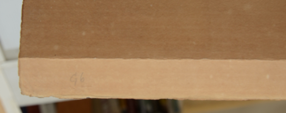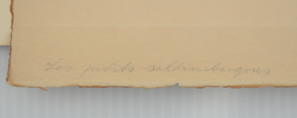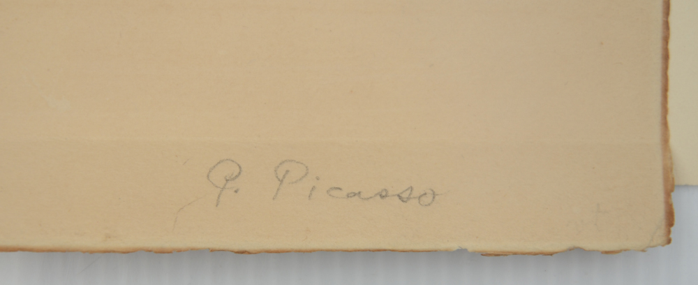 CONDITION: Discoloration from masking tape extending across upper margin, hinge mounted in upper margin, pencil inscription ''Les Petits Saltimbanques'' lower left, marked P Picasso lower left. Lower 1'' of sheet page is folded over in frame, several scattered spots of foxing, pale to mild toning throughout. Areas exposed to light have been darkened.