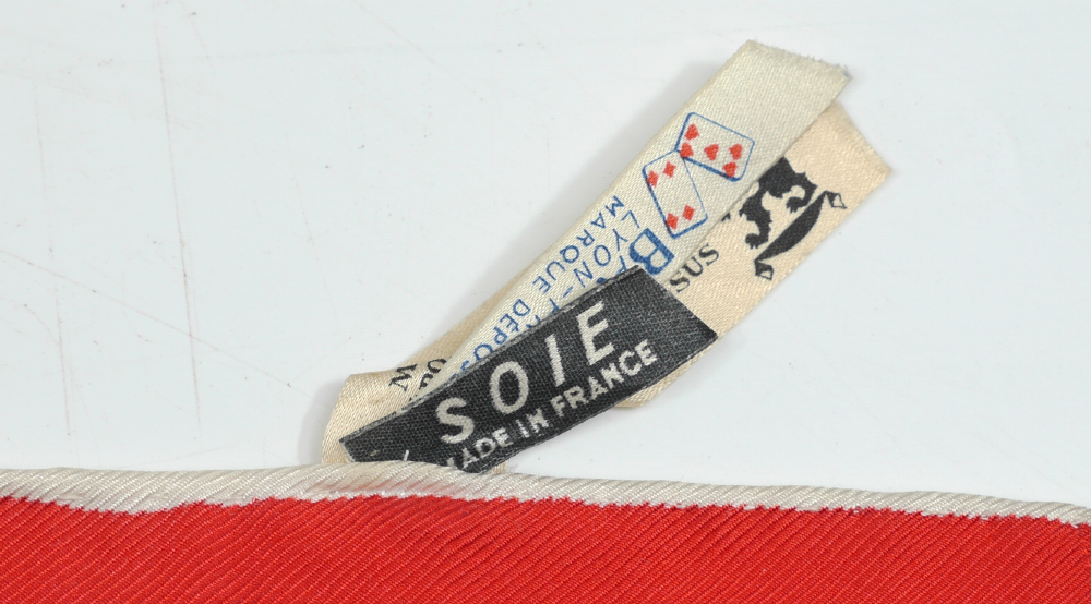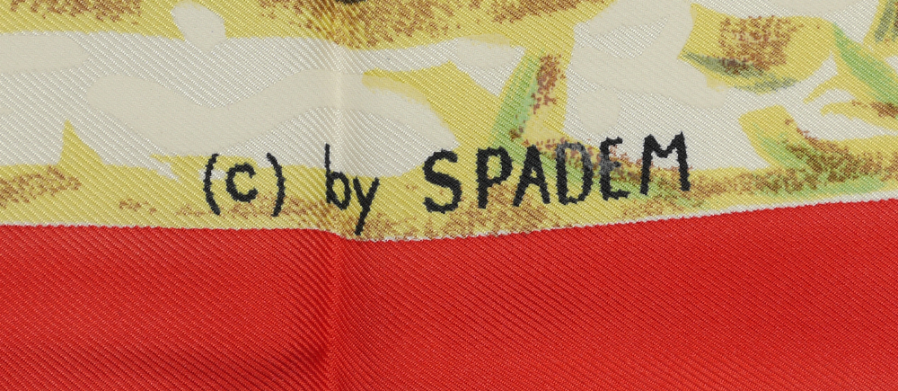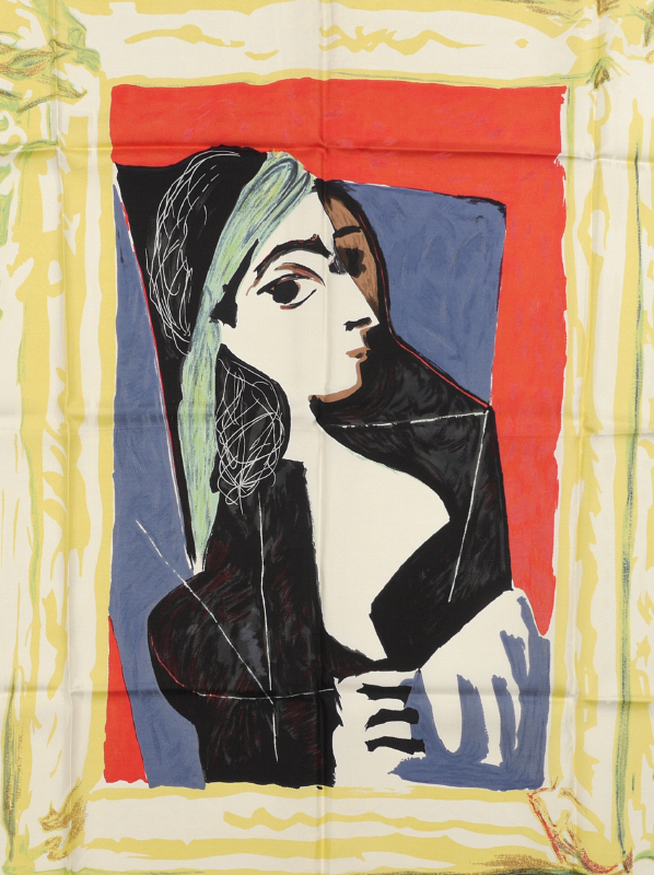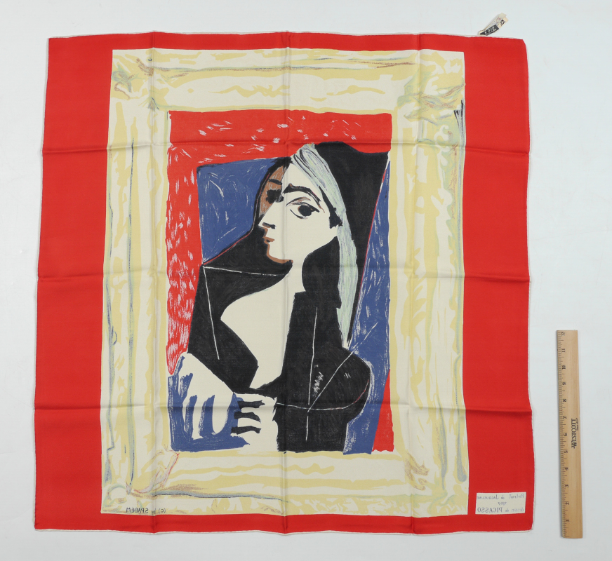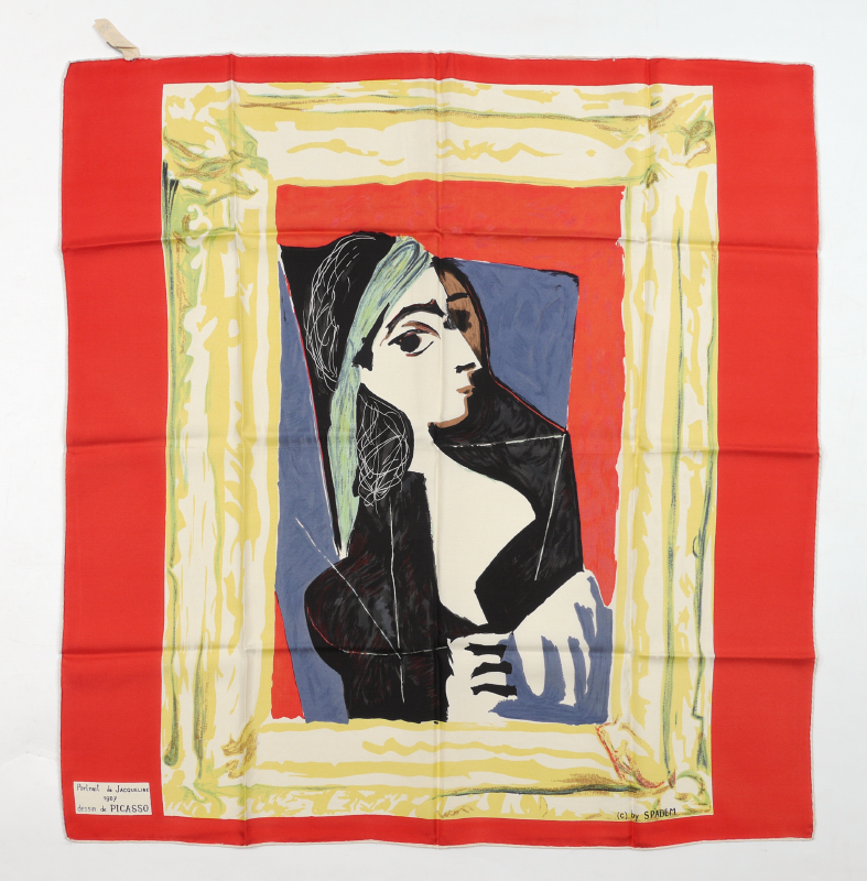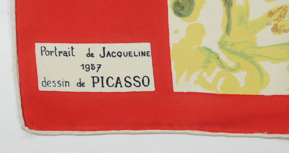 PICASSO, Pablo, (Spanish, 1881-1973): Silk scarf titled ''Portrait de Jacqueline, 1957, dessin de Picasso'', copyright Spadem, 3 attached French Soie tags. Measures 30'' x 30''.