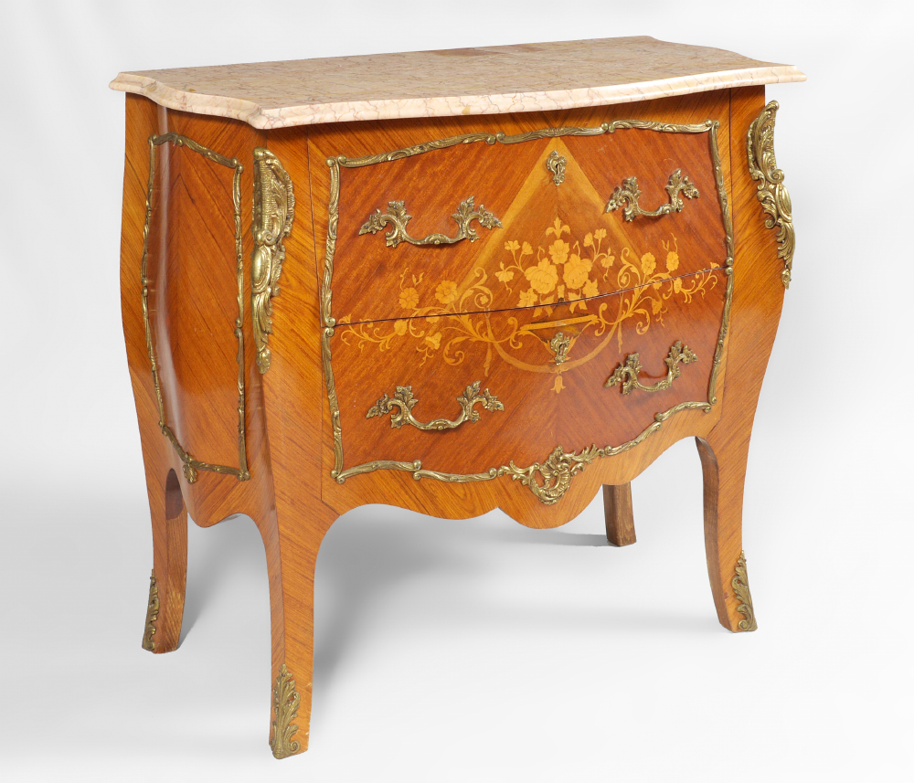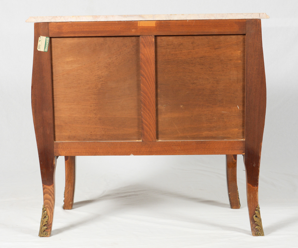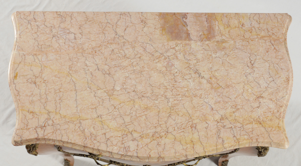 DIMINUTIVE MARBLE TOP MARQUETRY INLAID BOMBE COMMODE: Shaped pink variegated marble top, bombe French Empire style base with floral marquetry, gold decorated metal mounts. Overall measures 30 1/2'' h. x 32 1/4'' x 17''.