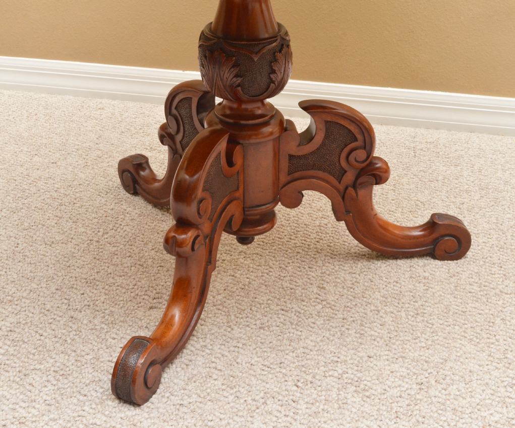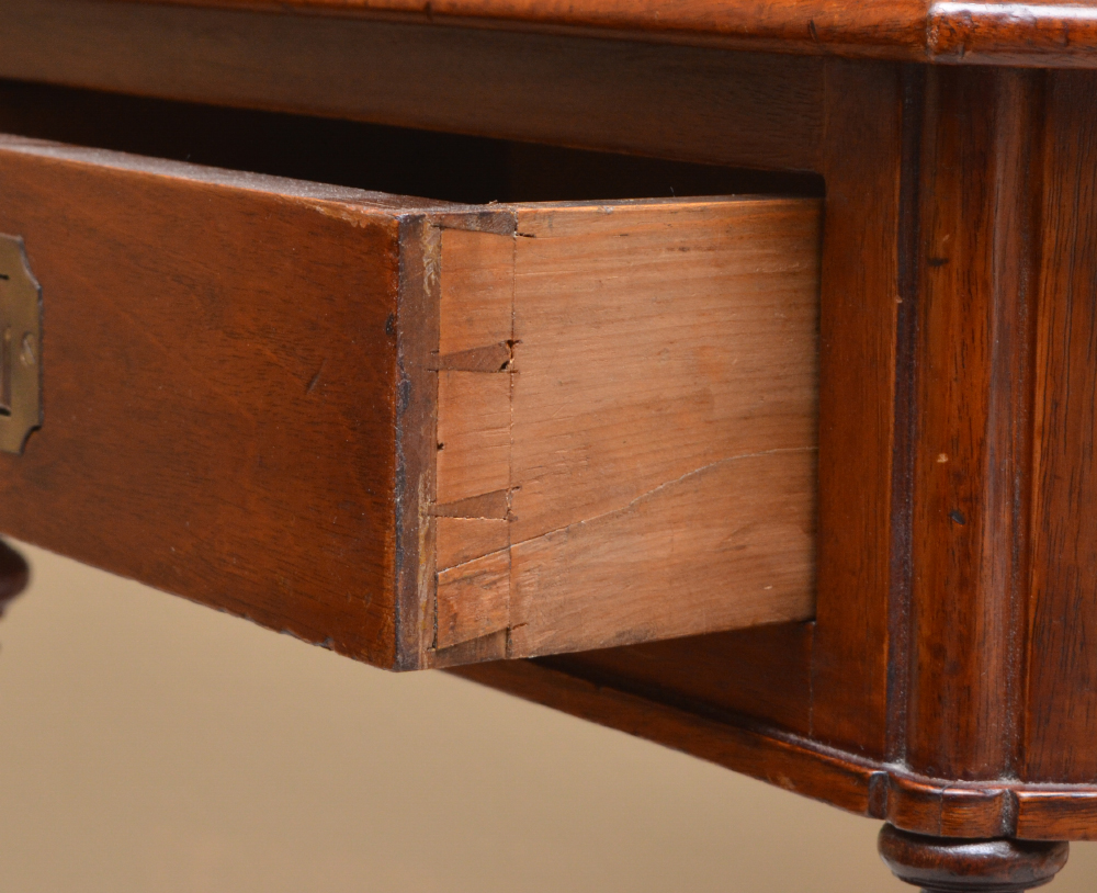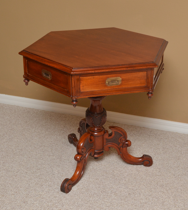 ENGLISH MAHOGANY HEXAGONAL RENT TABLE: 6 sided top, skirt with 3 drawers and 3 false drawers, carved and turned column support, 3 carved splayed legs. Overall measures 31'' h. x 29 1/4''.