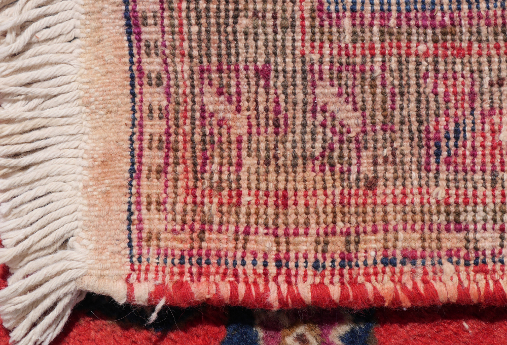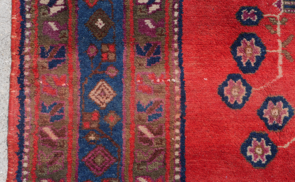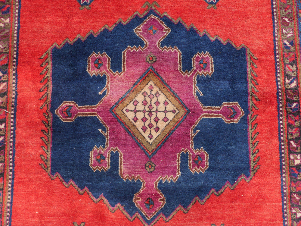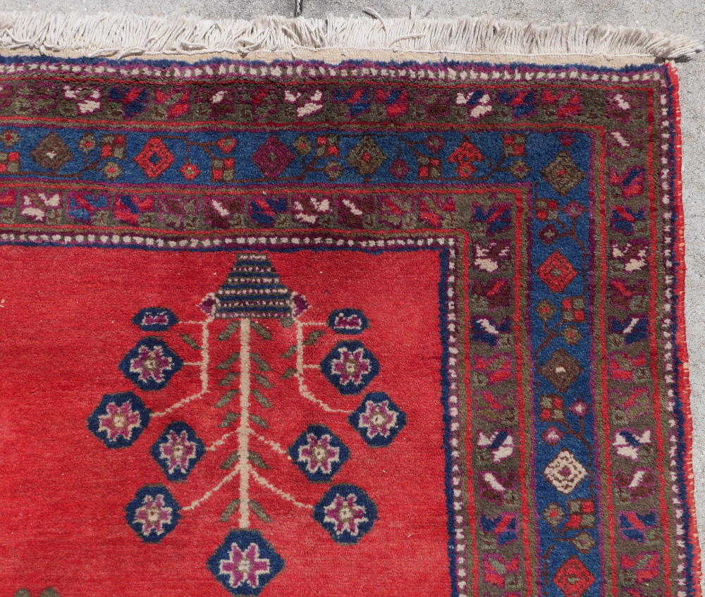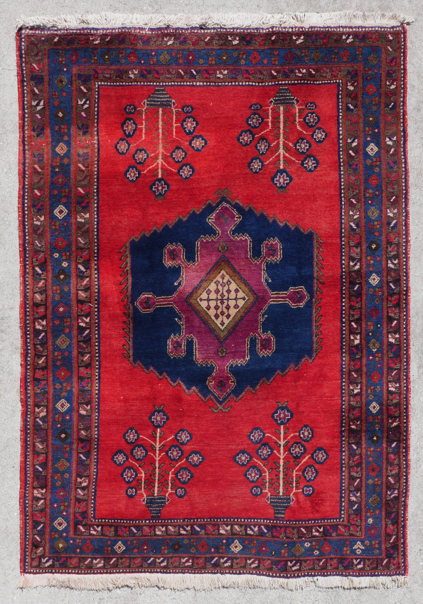 SEMI-ANTIQUE NW PERSIAN OR CAUCASIAN HAND KNOTTED WOOL RUG, 5' x 6'9'': This charming village rug has an ivory diamond surrounded by a raspberry geometric design that rests on a deep blue outer medallion. Two large flower pots with flowers adorn each end of the field. This is a cool work of art. Condition is good for its age.