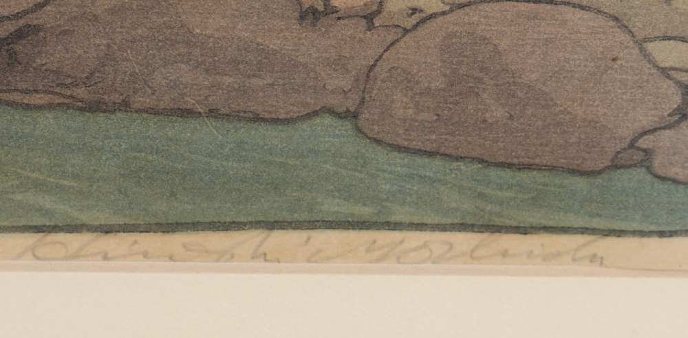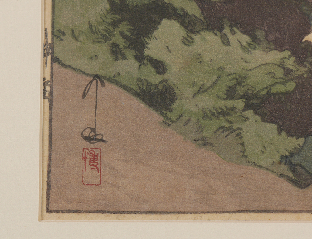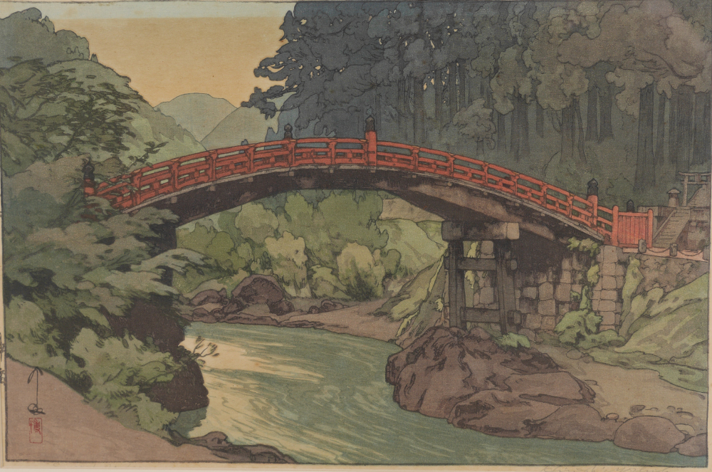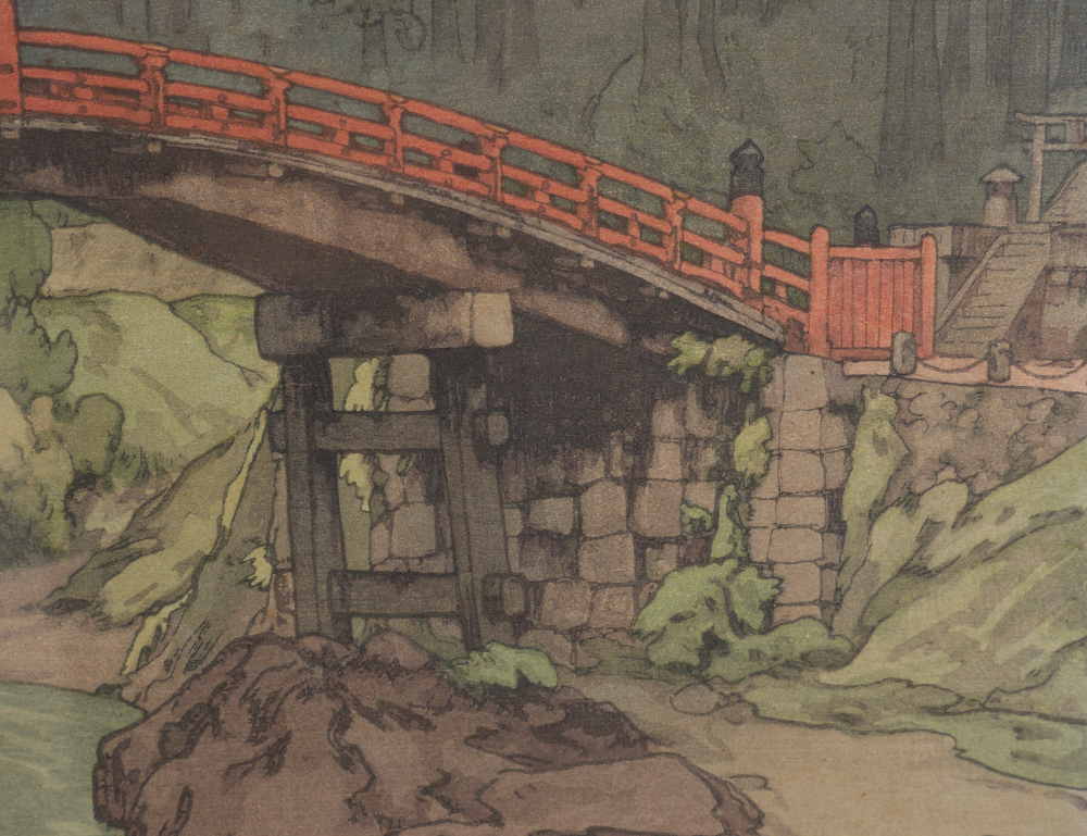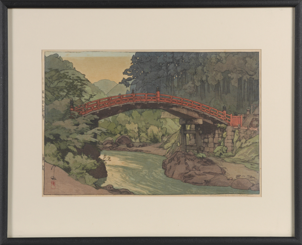 YOSHIDA, Hiroshi, (Japanese, 1876-1950): ''Sacred Bridge at Nikko'', Woodblock, sight size 10'' x 15'', pencil signed lower right, titled lower left, Jizuri seal in left margin, framed, 17'' x 21''.