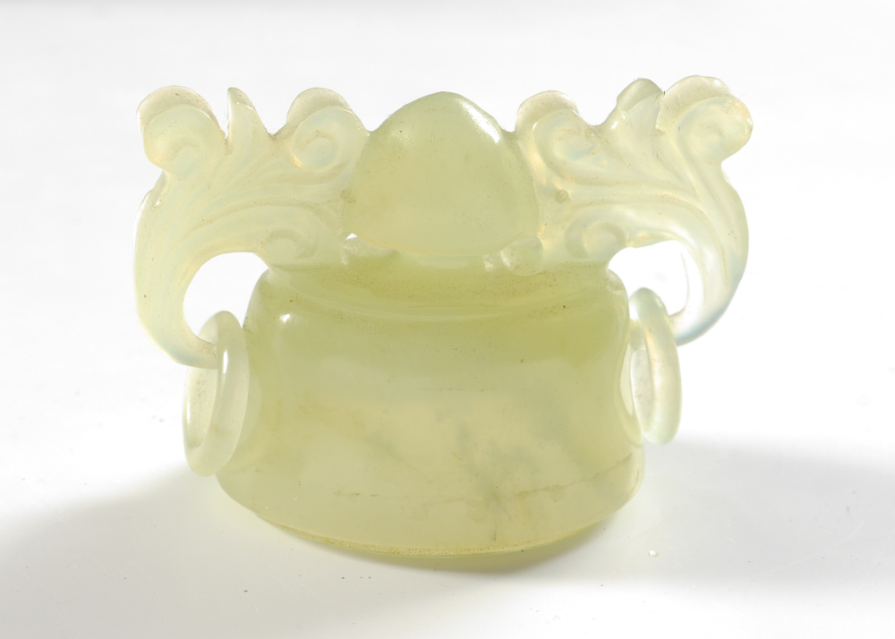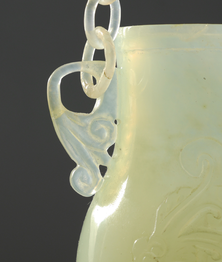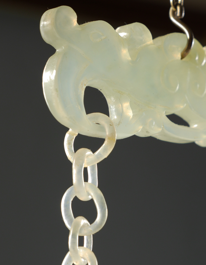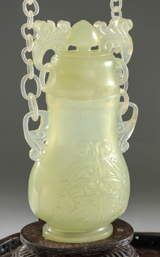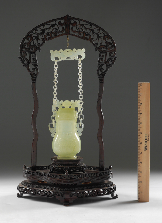 CHINESE CARVED JADE CENSER WITH STAND: Jade or similar stone carved censer with lid, chains and upper hanging plaque. Fine pierced carved wood stand, overall measures 19'' h. x 10 1/2'' x 7''.