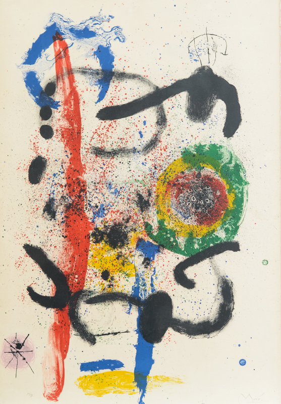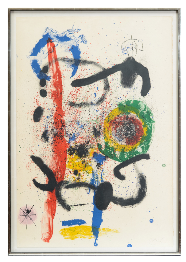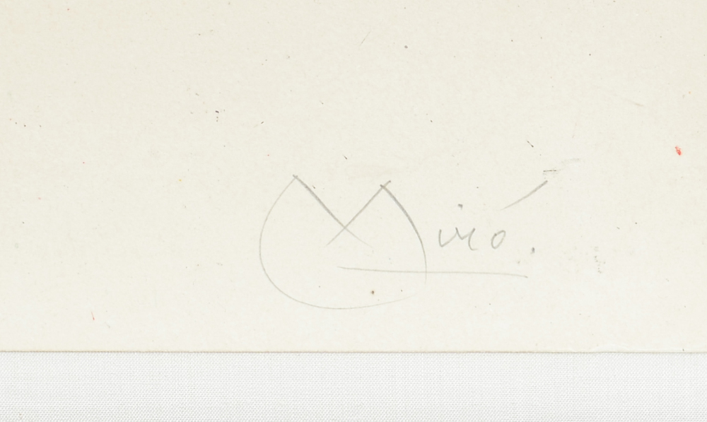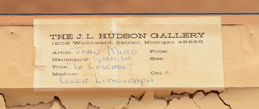 MIRO, Joan, (Spanish, 1893-1983): ''La Cascade'', Lithograph, sight size 35.125'' x 23.75'', pencil signed lower right, numbered 13/75lower left, vintage silver gilt frame, 38'' x 26.5'', J. L. Hudson Gallery label affixed verso.