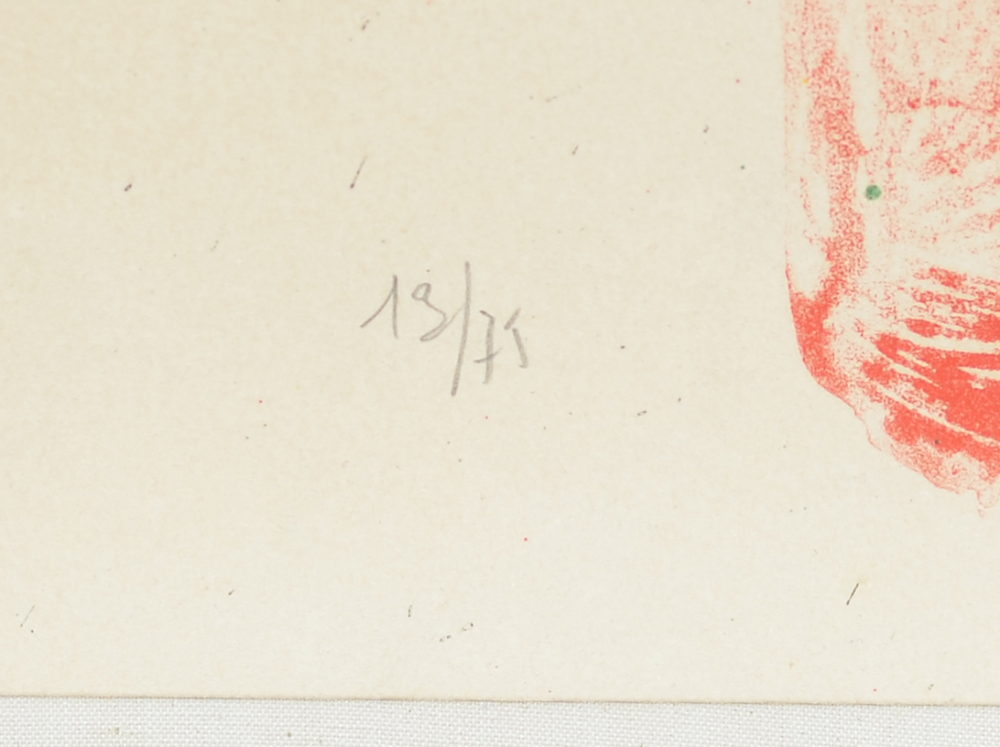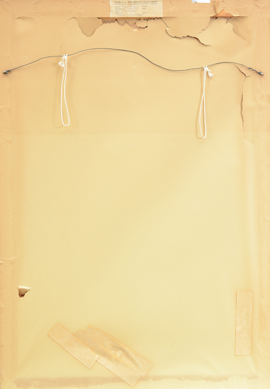 CONDITION: Float mounted, several scattered pale spots, small area of bleaching in upper right corner, not examined out of frame, frame shows wear, sold as is.