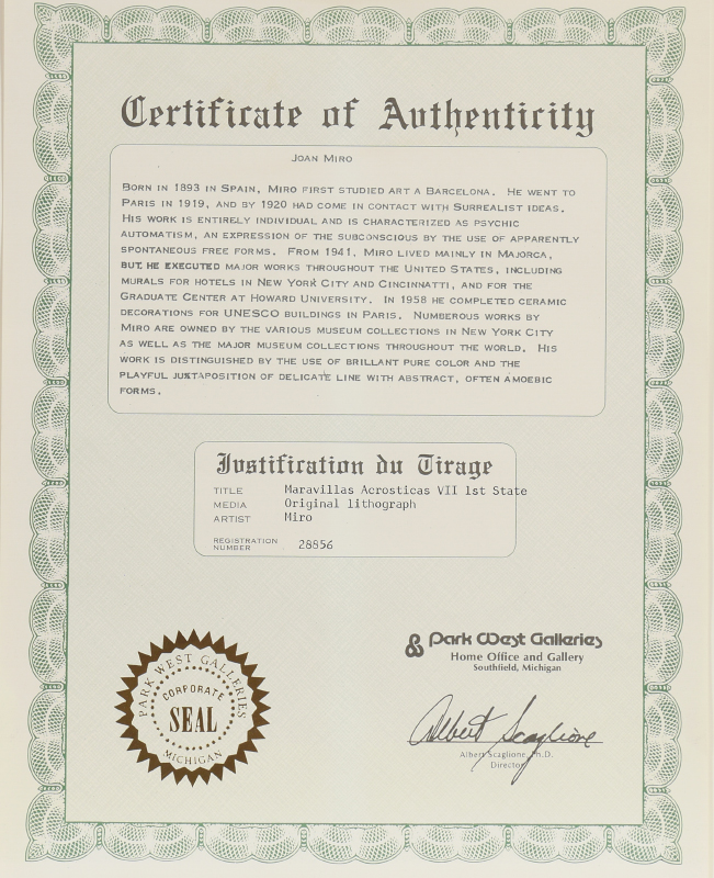 MIRO, Joan, (Spanish, 1893-1983): ''Maravillas Acrosticas VII'', 1st State, Lithograph, sight size 25.5'' x 15.5'', pencil signed lower right, numbered HC lower left, Park West justification du tirage envelope affixed verso, metal framed, 34.5'' x 24''.