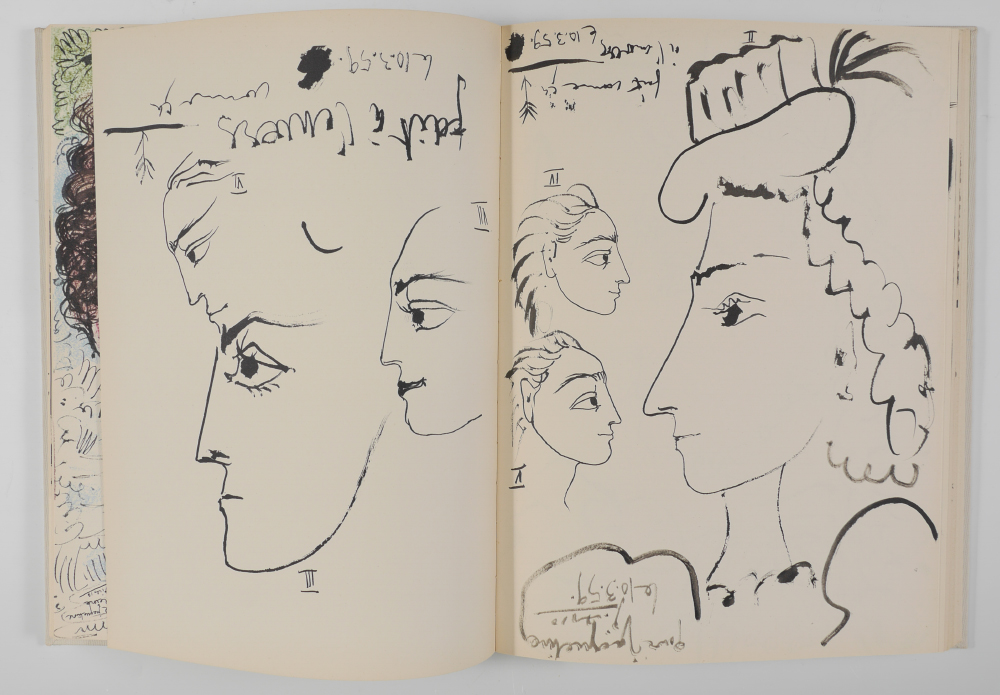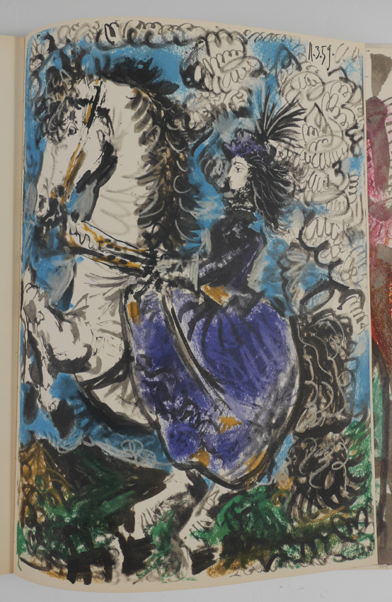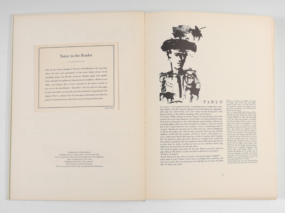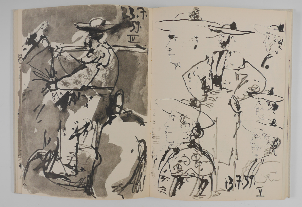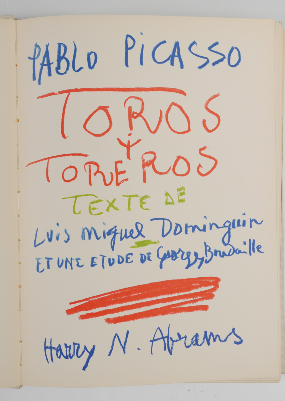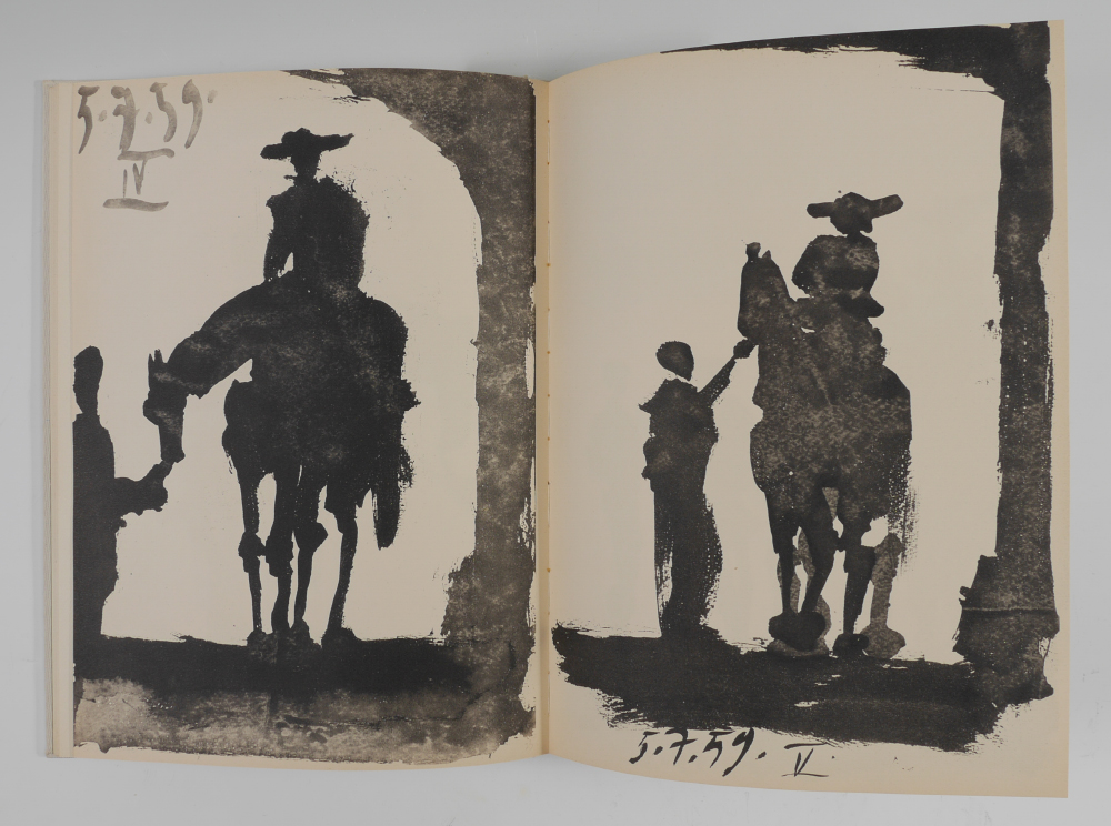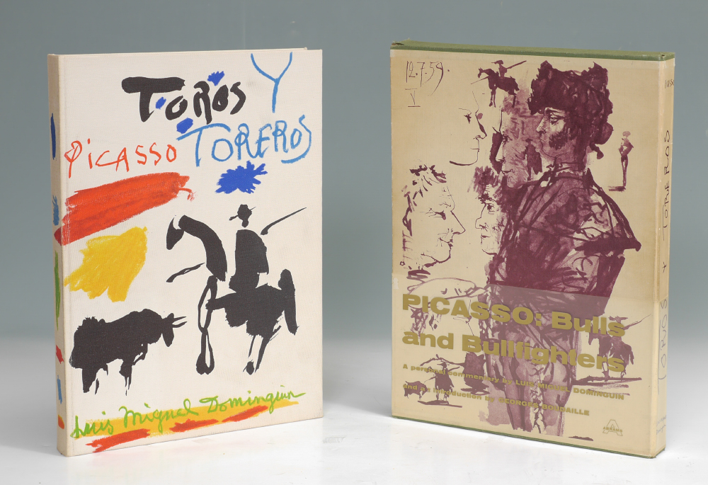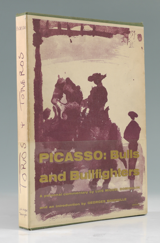 PICASSO, Pablo, (Spanish, 1881-1973): ''Bulls & Bullfighter'', alternate title ''Toros Y Toreros'' book, commentary by Luis Miguel Dominguin, published 1961, Abrams, New York. Cloth boards and covers, original slip case with printed plastic title. Original note card insert inside book. 15 1/4'' x 11 1/4'' x 1 3/4''.