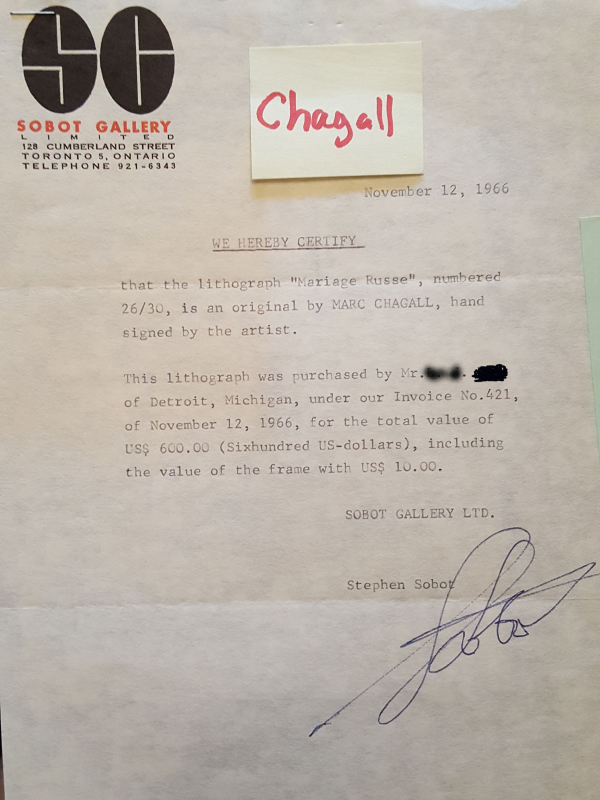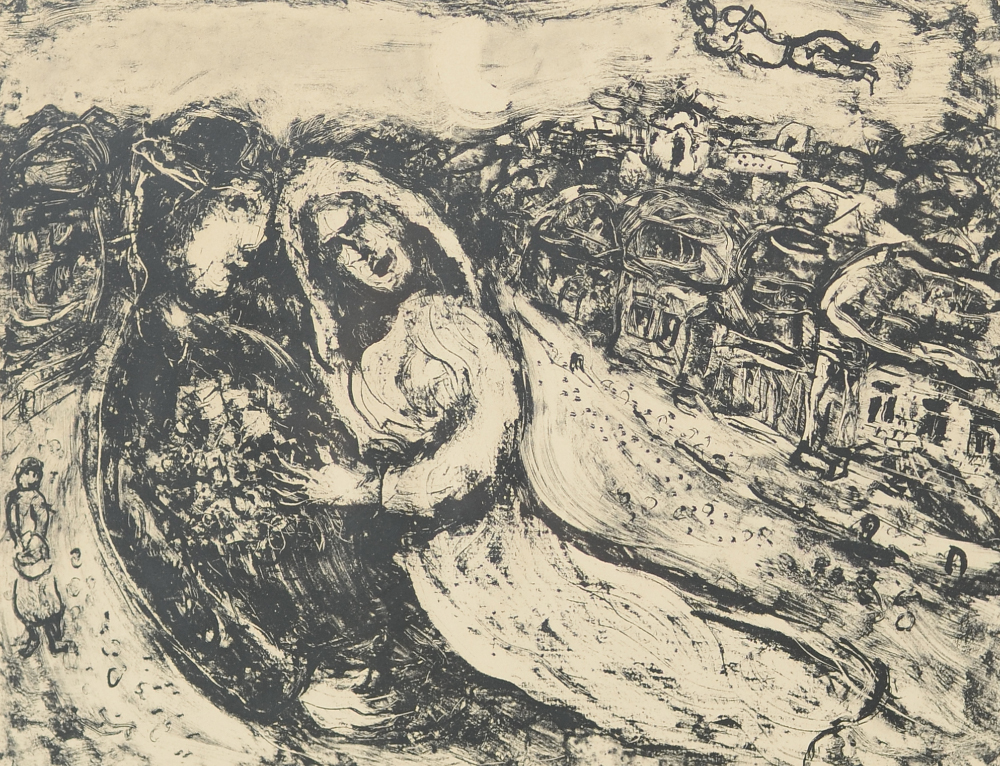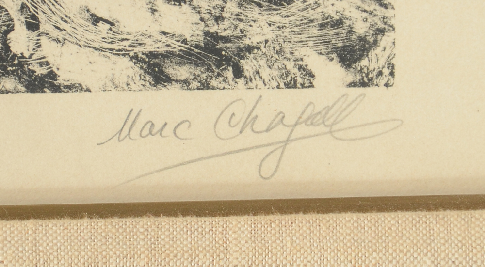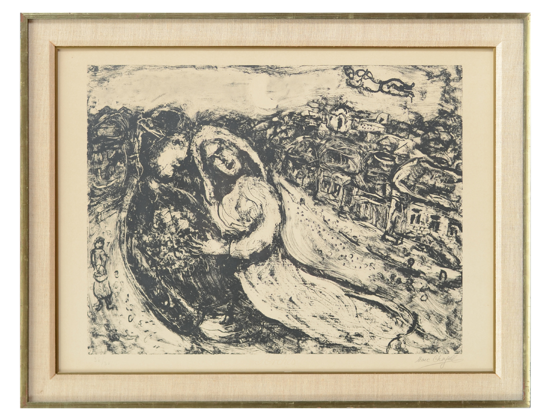 CHAGALL, Marc, (French, 1887-1985): ''The Marriage'', Lithograph on Arches paper, sight size 21.75'' x 29.5'', pencil signed lower right, numbered 26/30 lower left, vintage silver gilded frame, 26.75'' x 34.5''. Copy of original receipt from Sobot Gallery, 1966.