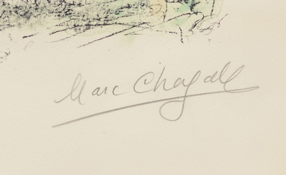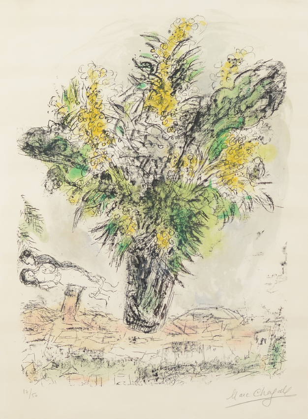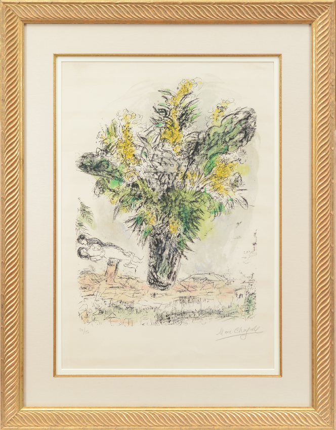 CHAGALL, Marc, (French, 1887-1985): ''Les Mimosas'', Lithograph, sight size 28.5'' x 19.5'', pencil signed lower right and numbered 17/50 lower left, fine gilded and carved frame, 40.5'' x 31.5''.