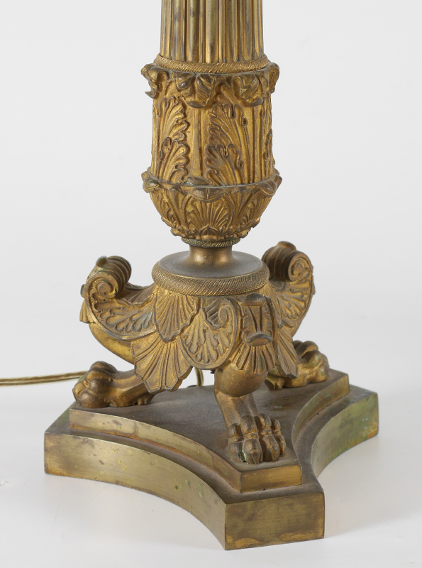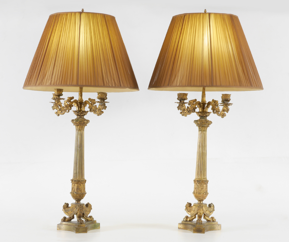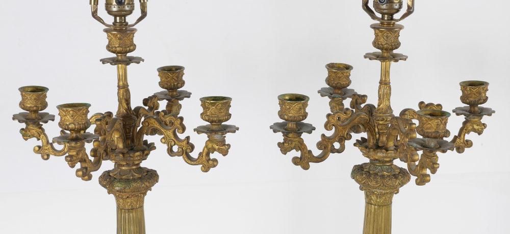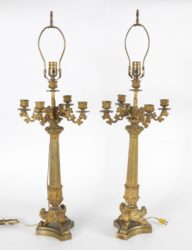 PAIR FRENCH 19TH CENTURY CANDELABRA LAMPS: Patinated cast metal base with 4 stylized dragon arms, fluted column support with acanthus leaf, 3 dragon feet, ending in splayed base. single sock fixture with conversion to lamp at socket, base has not been drilled. Overall measures 34'' h. x 6 1/2''. Sold with cloth shades, 11 1/2'' x 18 1/4''.