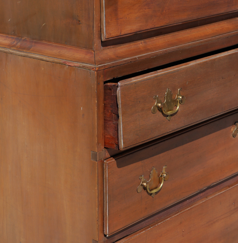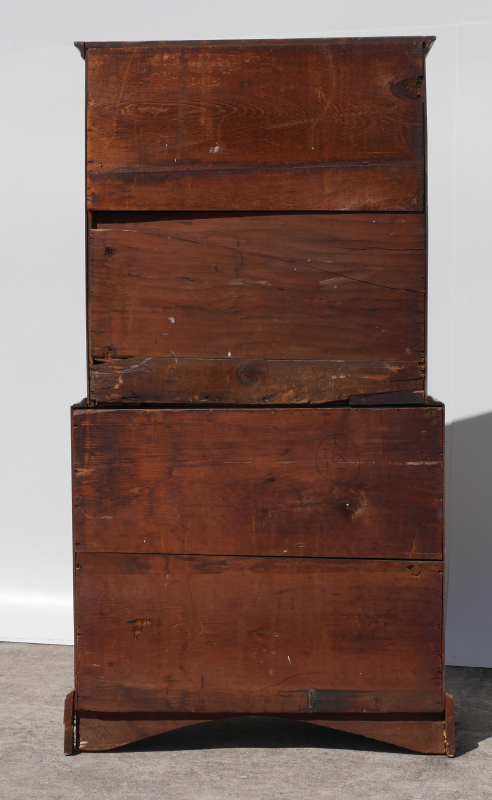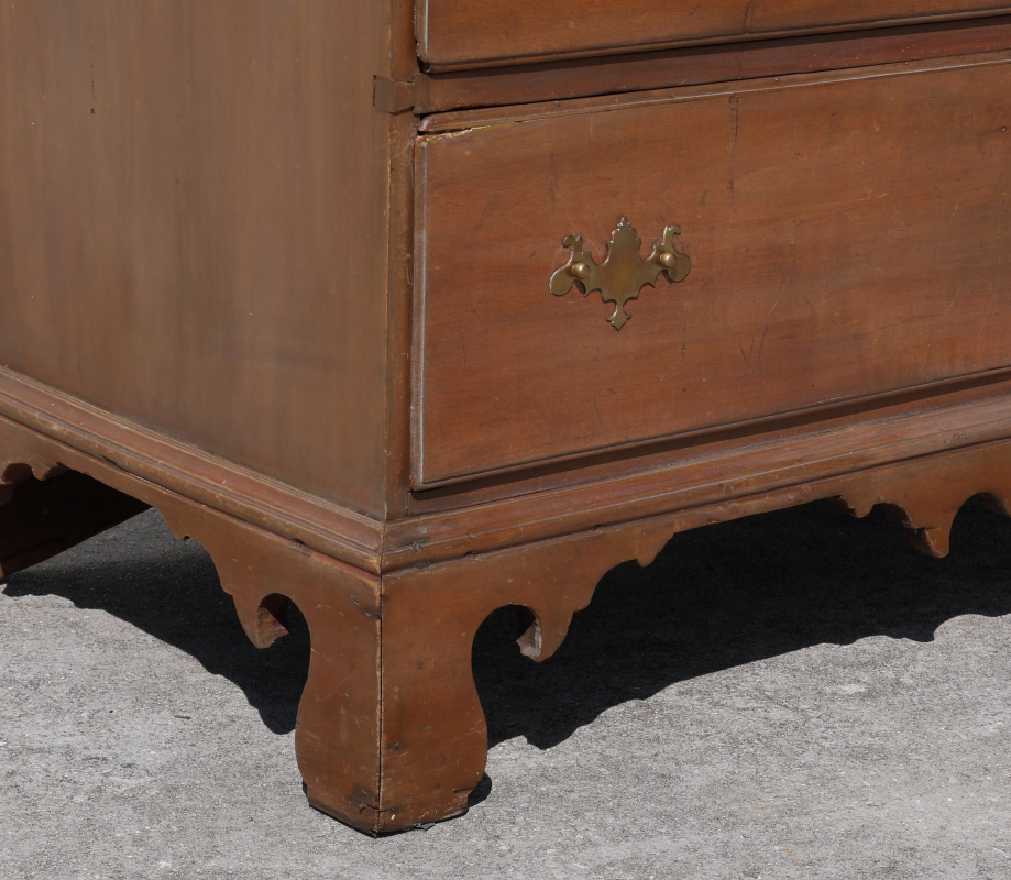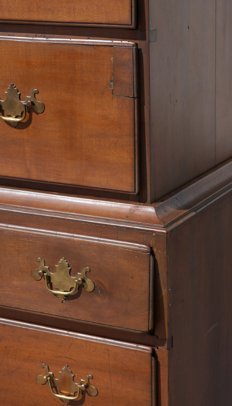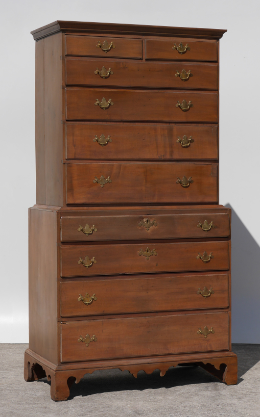 19TH CENTURY HIGHBOY CHEST OF DRAWERS: Top with 2 half drawers over 4 graduating full length drawers, base with 4 graduating drawers, shaped skirt and feet. Brass batwing pulls, overall measures 74'' h. x 38 3/4'' x 20''.