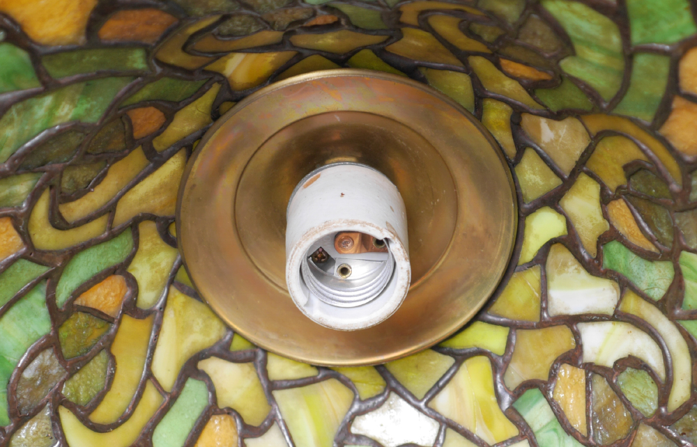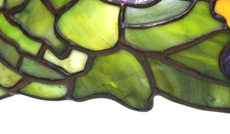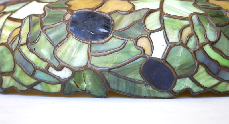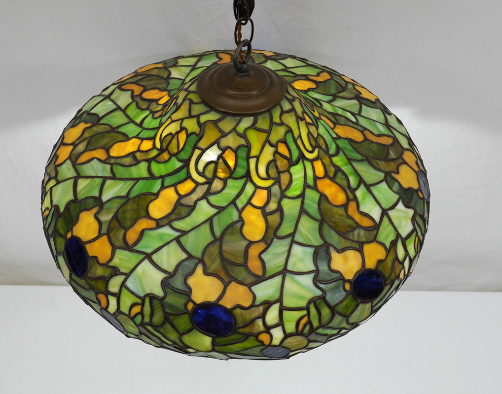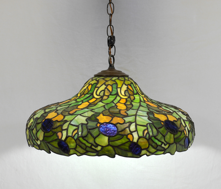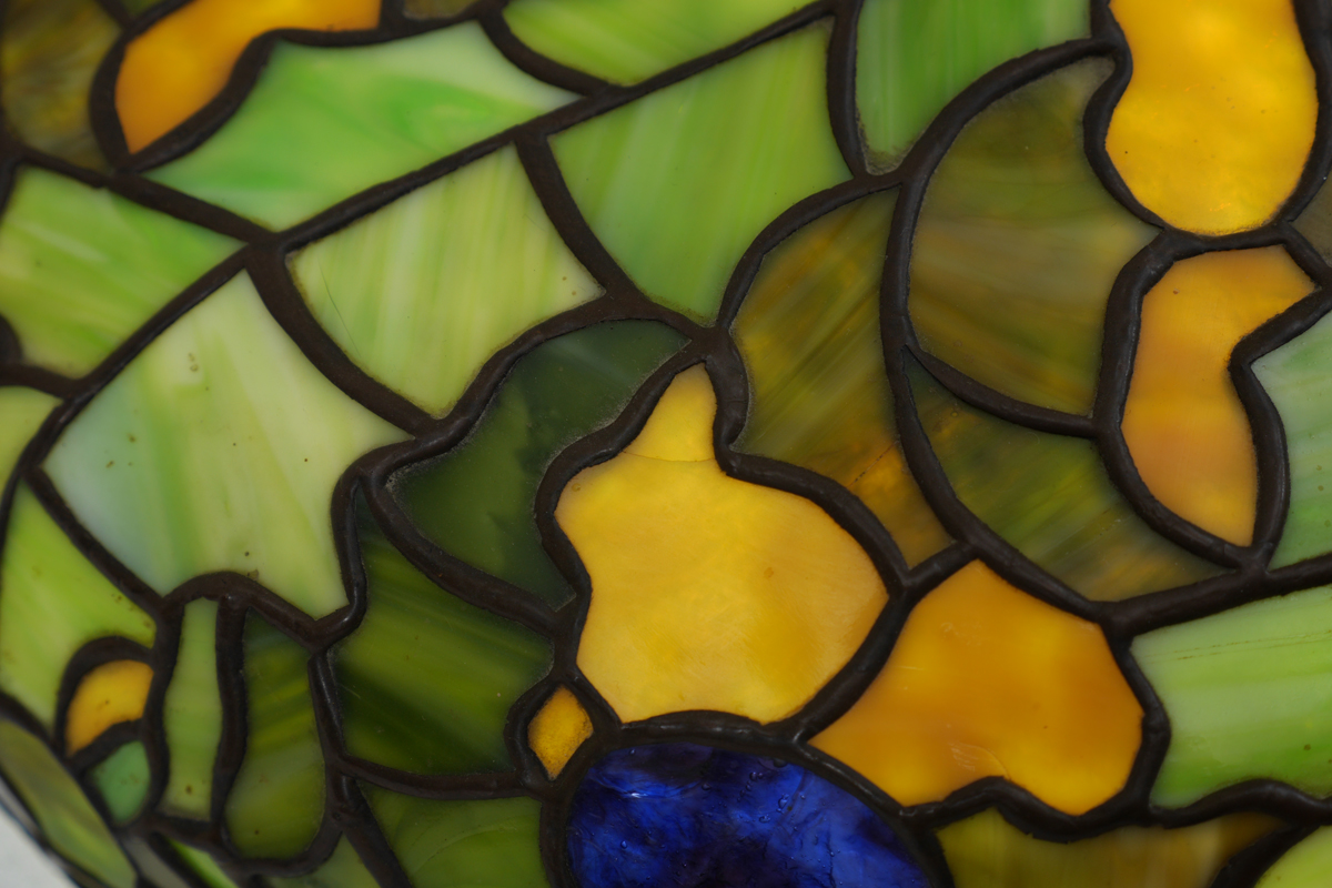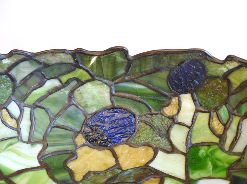 LEADED STAINED GLASS HANGING SHADE: Duffner & Kimberly quality bell form shade with shaped lower rim. Assorted colors with a twist pattern, no visible markings. Overall measures 11'' h. x 19 3/4'' dia.