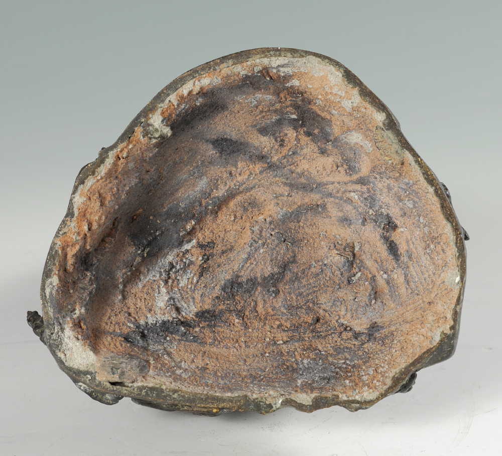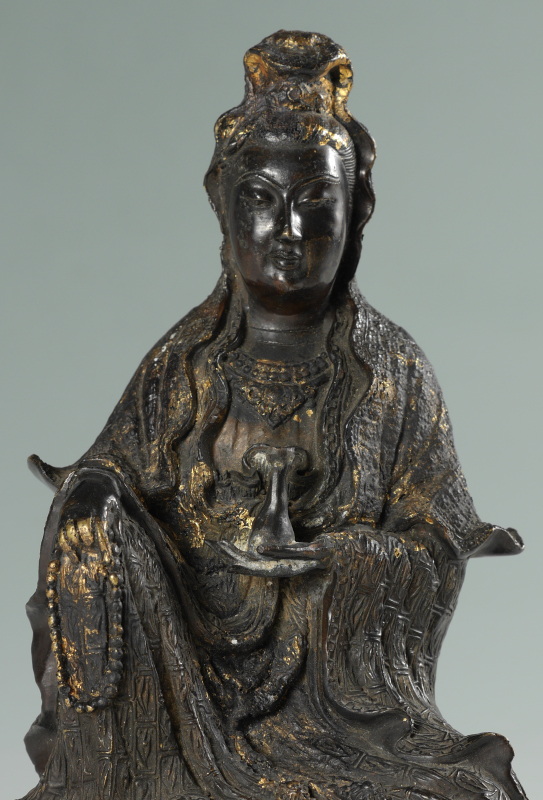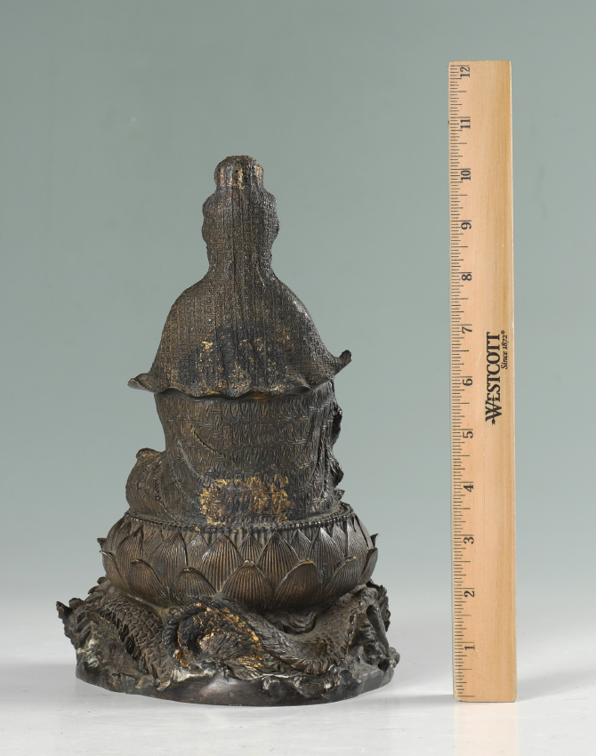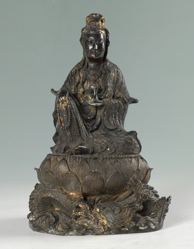 CHINESE BRONZE SEATED FIGURE OF QUANYIN: Figure of Quanyin or Guanyin seated on a lotus blossom above a dragon, traces of gilt accents remain. No visible markings or signature, measures 10 1/2'' h. x 7'' x 5 1/2''.